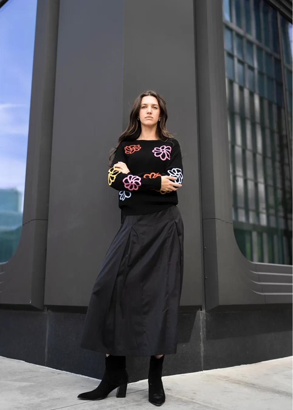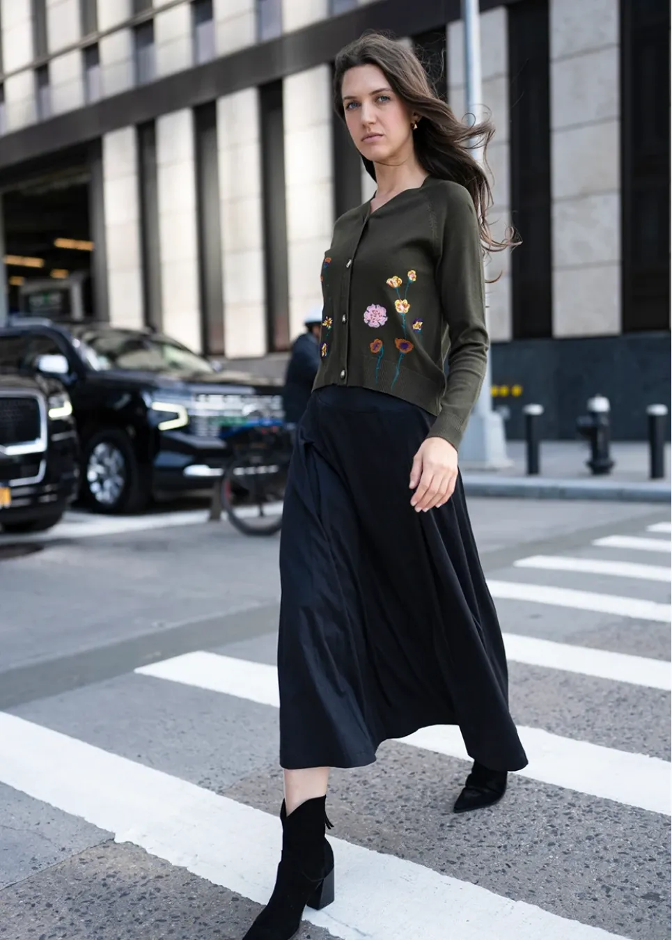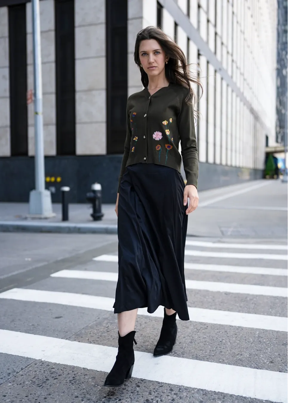 Released side pleats add easy movement to this clean A-line. A neat waist with button tabs and a back zip keeps the finish polished.