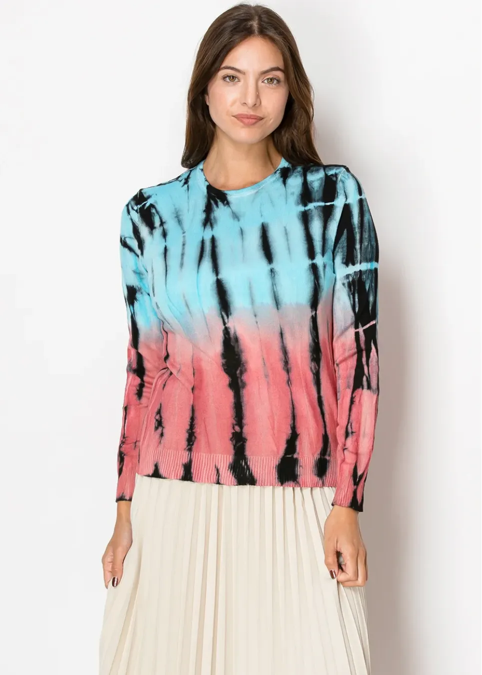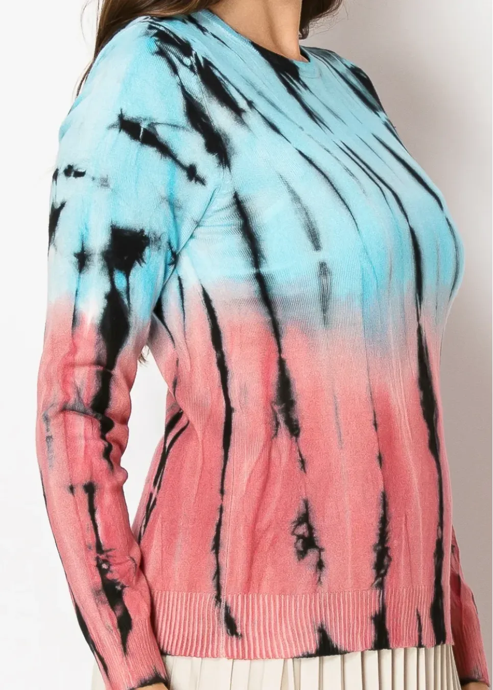 This soft and lightweight tie-dye sweater is the perfect blend of pink, blue, and black for a bold yet balanced look. With its relaxed fit and unique pattern, it’s a great choice for casual days or adding a splash of color to your wardrobe.