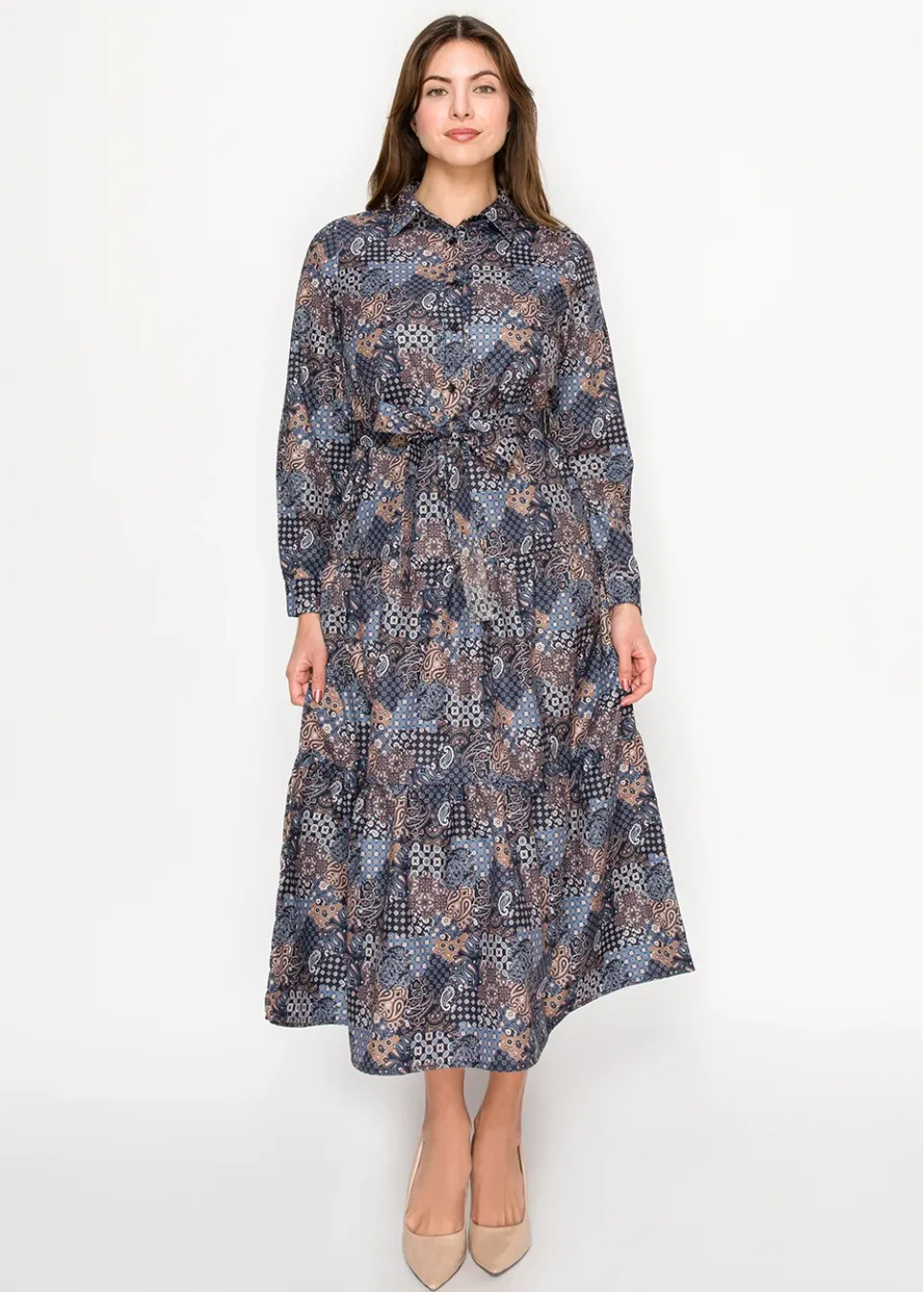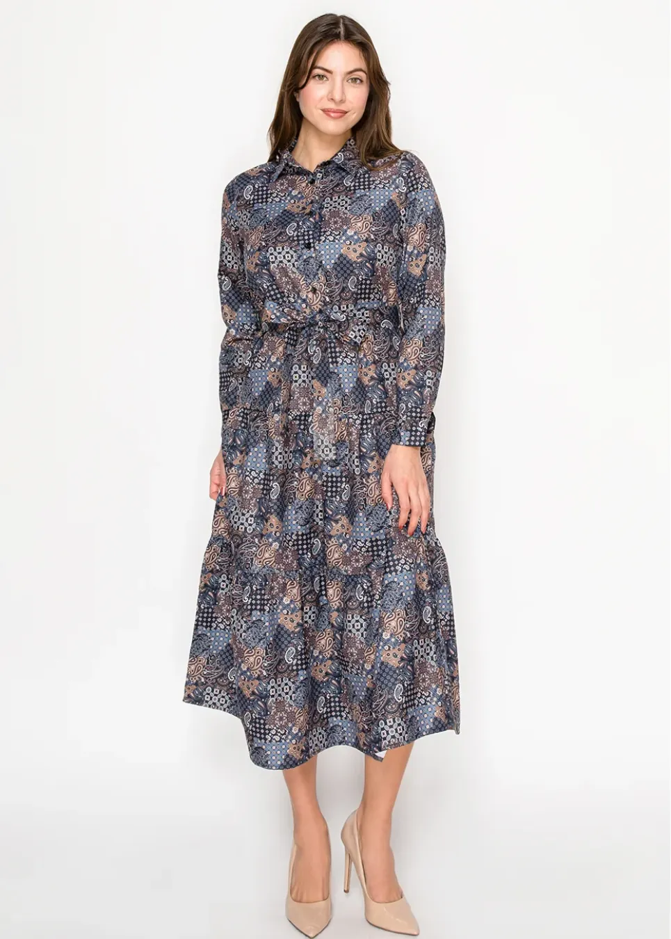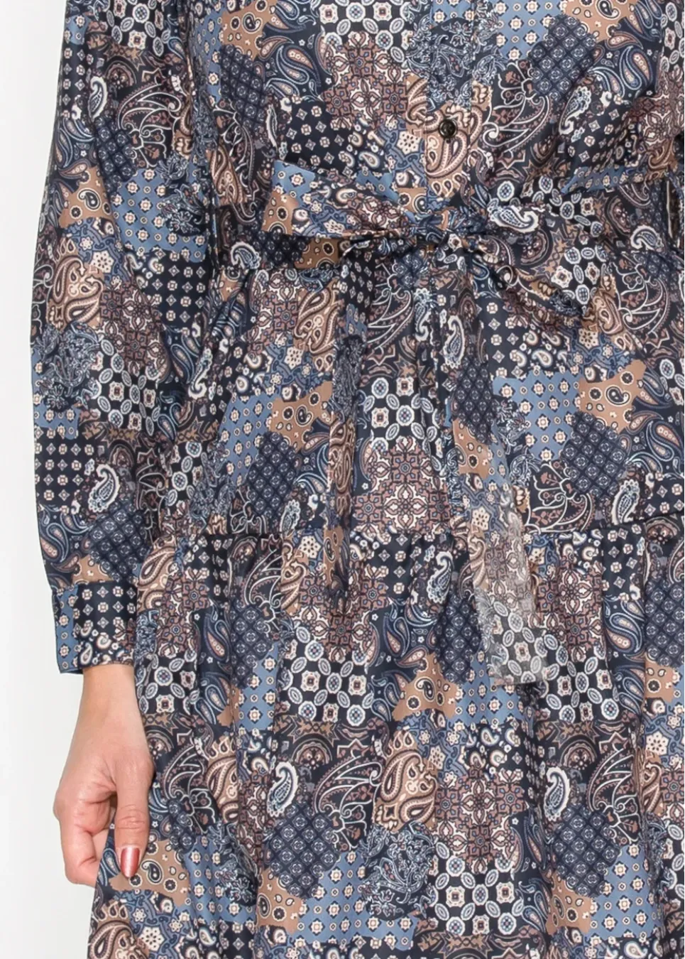 A refined take on the shirt dress, crafted in an intricate navy and camel patchwork paisley. Detailed with a pointed collar, waist-defining belt, and flowing tiered hem.