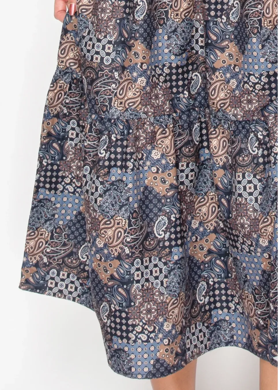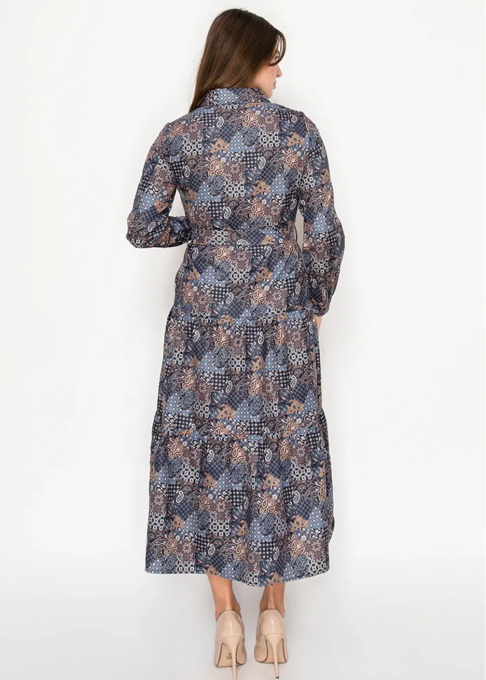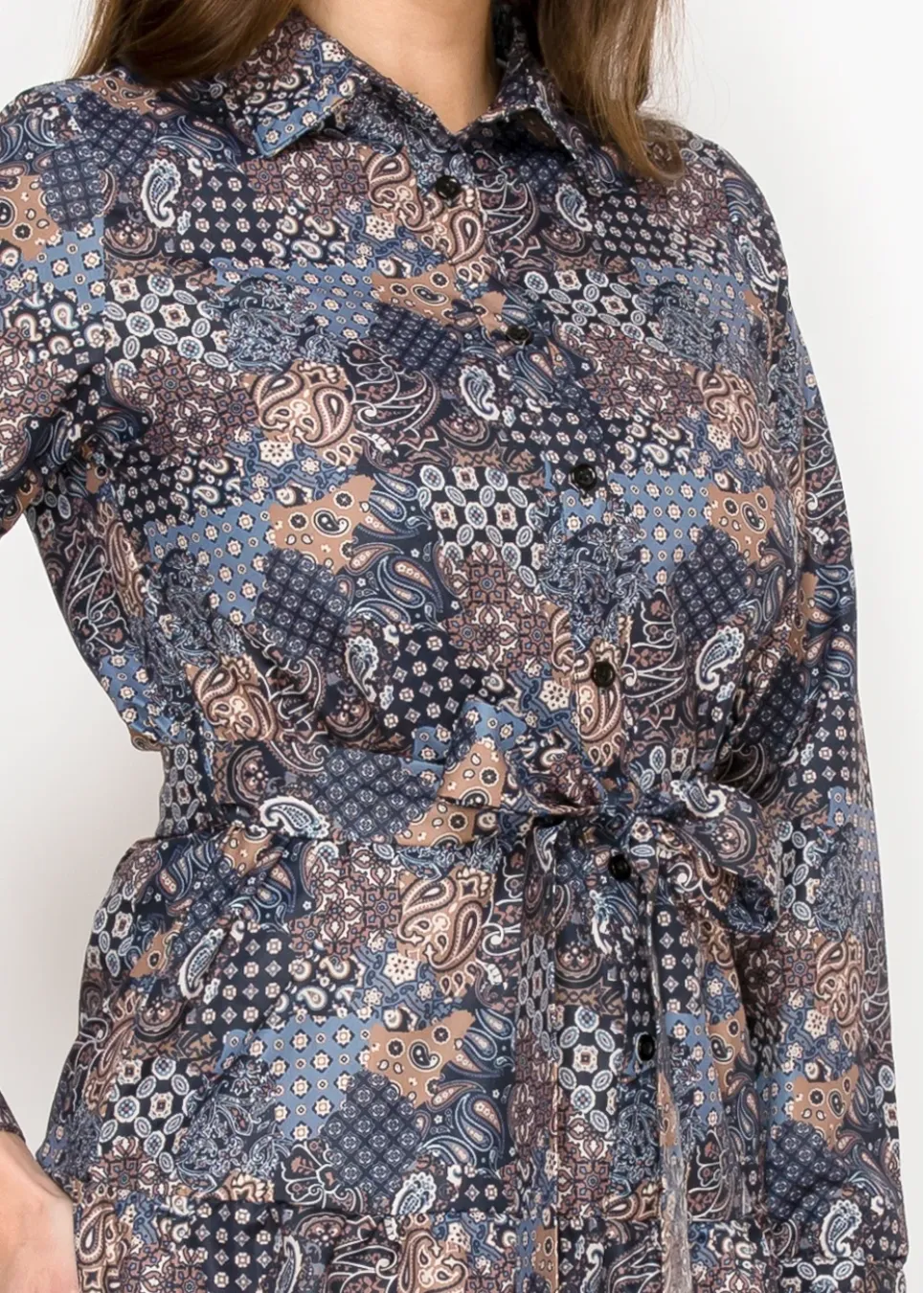 A refined take on the shirt dress, crafted in an intricate navy and camel patchwork paisley. Detailed with a pointed collar, waist-defining belt, and flowing tiered hem.