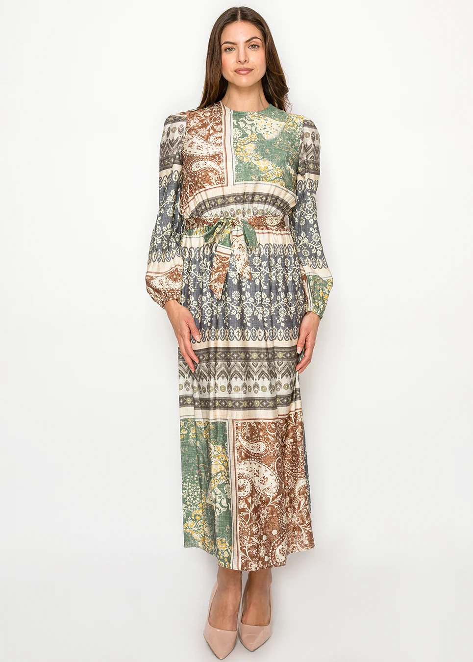 Balanced proportions make this one especially flattering: soft volume in the sleeves, definition at the waist, and a skirt that falls smoothly without extra bulk.