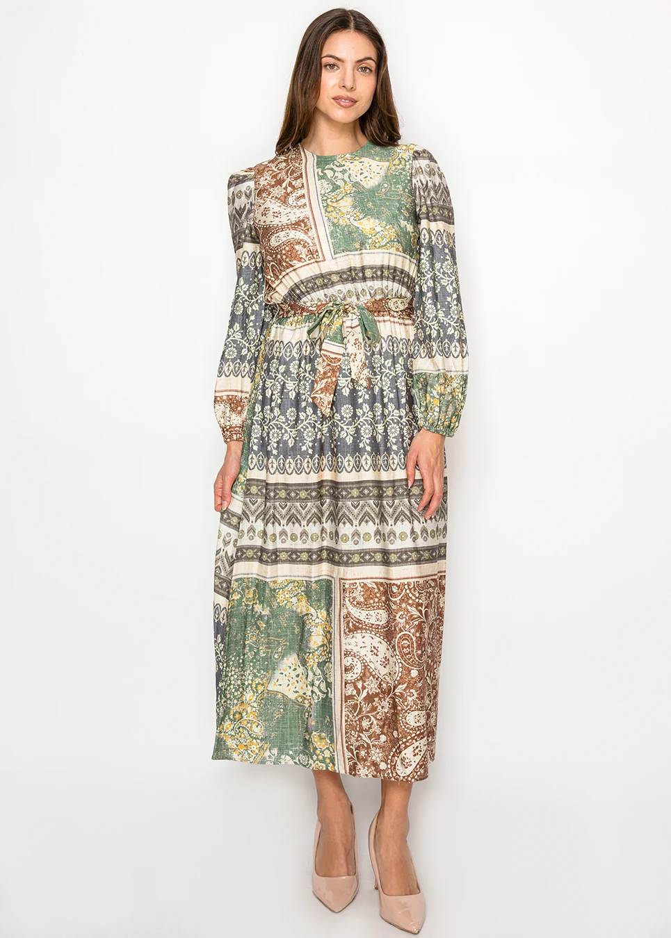 Patchwork Tie Waist Long Sleeve Dress