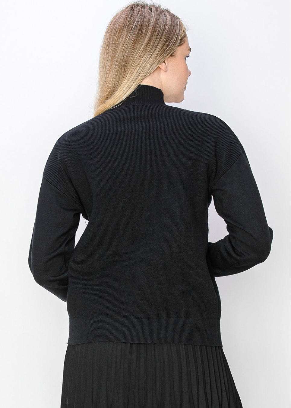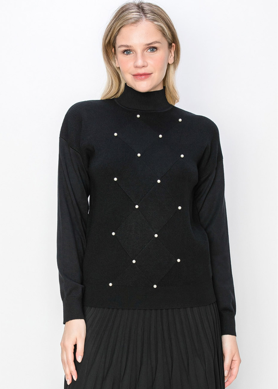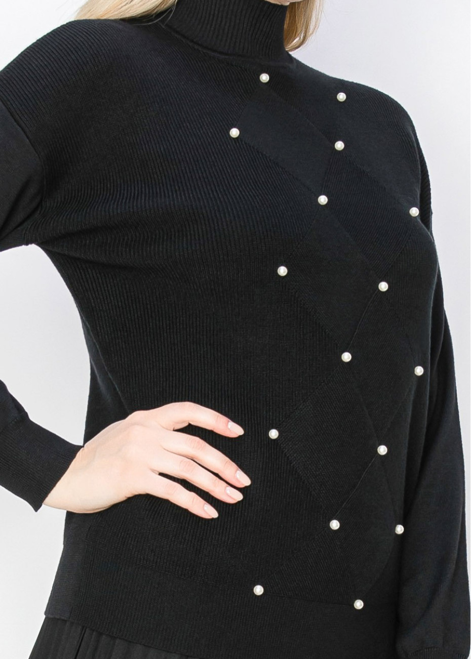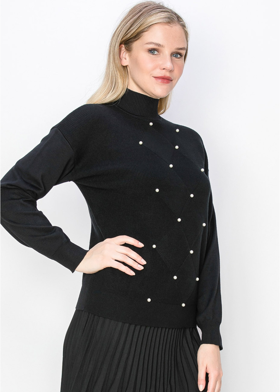 Dressed up with subtle pearl details, this black sweater offers a refined, elegant touch to your wardrobe. The soft ribbed knit adds texture, while the pearls arranged in a diamond pattern elevate the simple silhouette for a sophisticated look.
