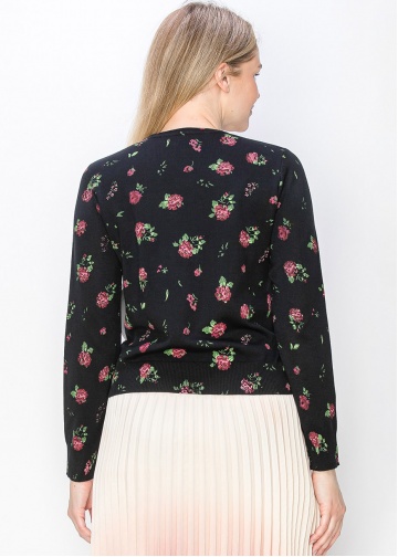 Featuring a subtle pattern of pink roses, this black sweater combines comfort with a hint of femininity. Perfect for pairing with skirts, it’s a versatile piece that adds a soft floral touch to your look.