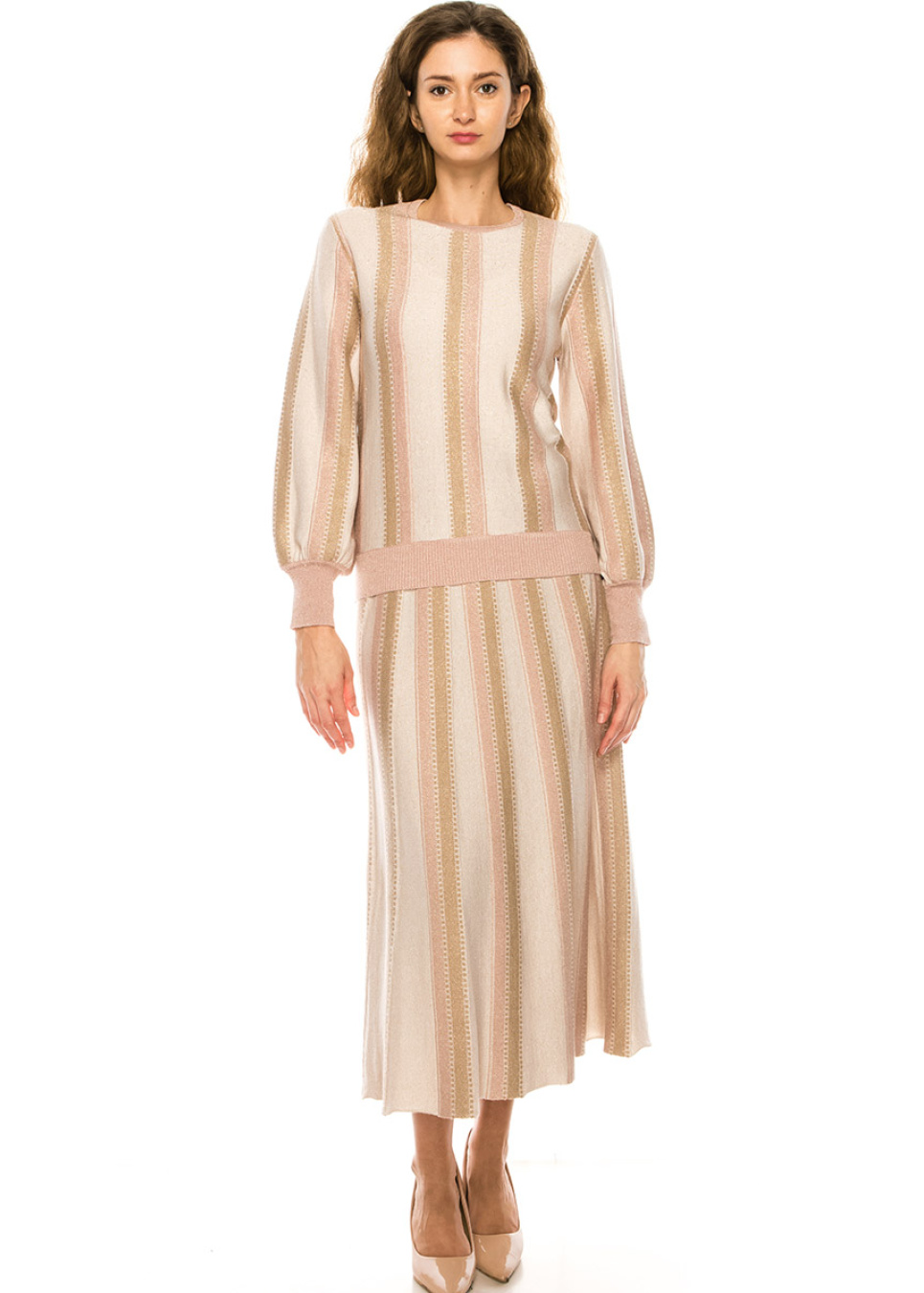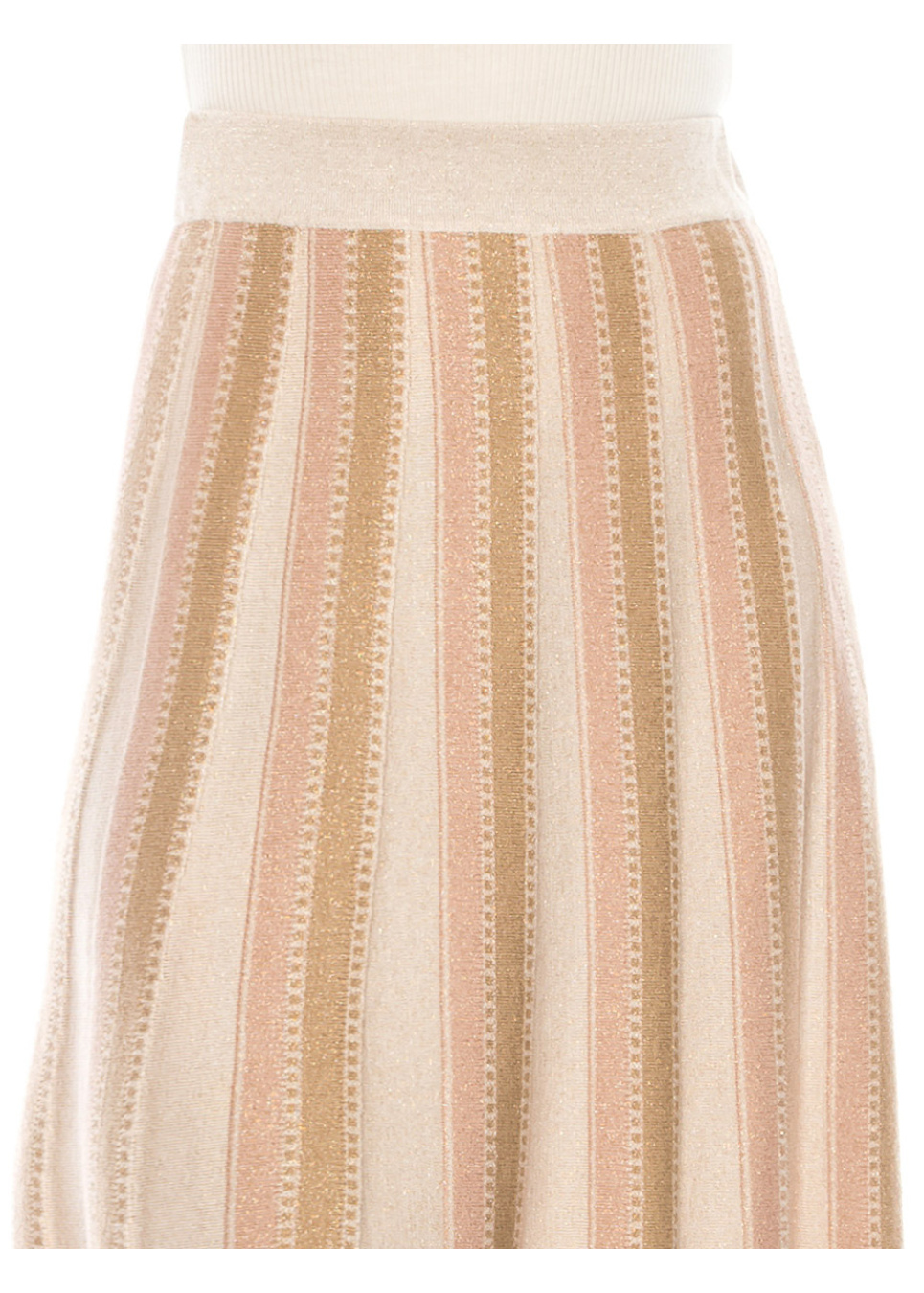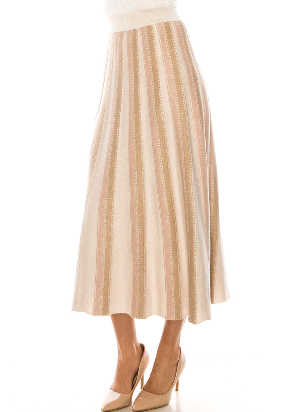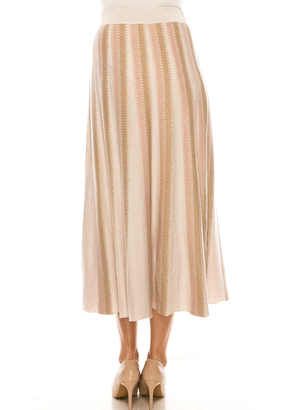 Certainly, this pink midi skirt with vertical stripes is both playful and sophisticated, while also featuring an A-line silhouette that accentuates a flattering and feminine shape. The A-line design begins at the narrow waist and gradually widens towards the hemline, allowing for a graceful and flowing movement with each step.