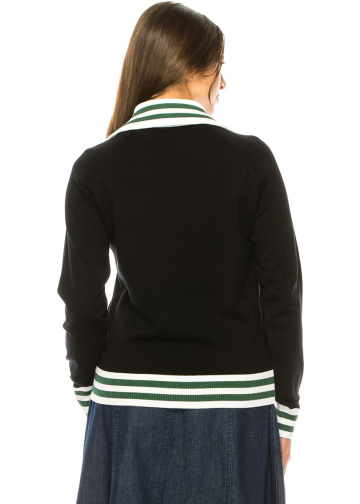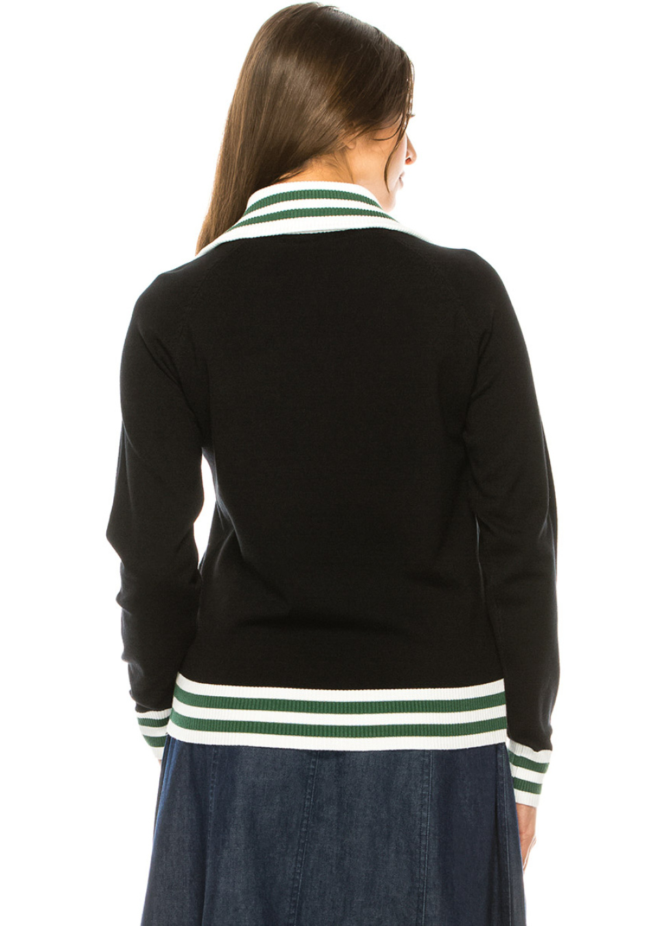 This comfortable black sweater is the perfect addition to your casual wardrobe. The three-quarter zip and shirt collar make it a versatile piece that's perfect for any occasion, while the ribbed cuffs with stripes add a touch of texture and interest.