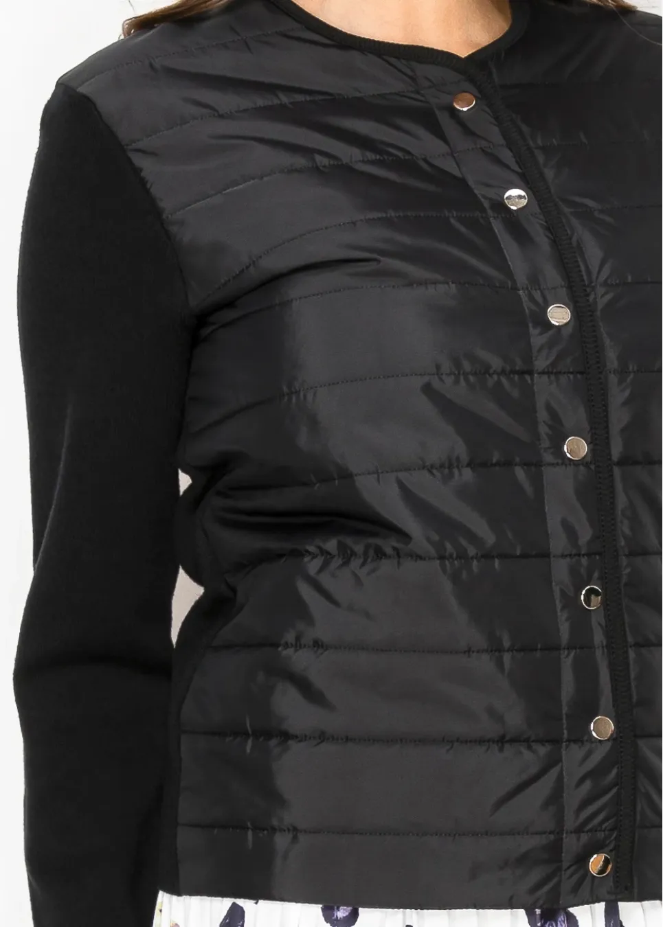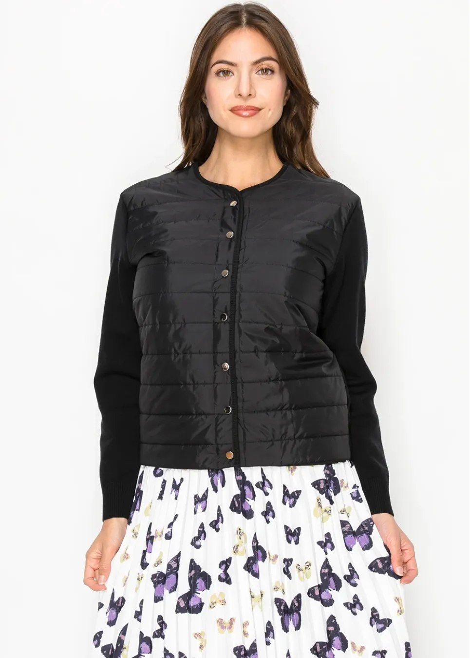 This cardigan is the best of both worlds—cozy knit meets a quilted front for just the right amount of warmth. The snap buttons add a polished touch, making it easy to dress up or keep casual.