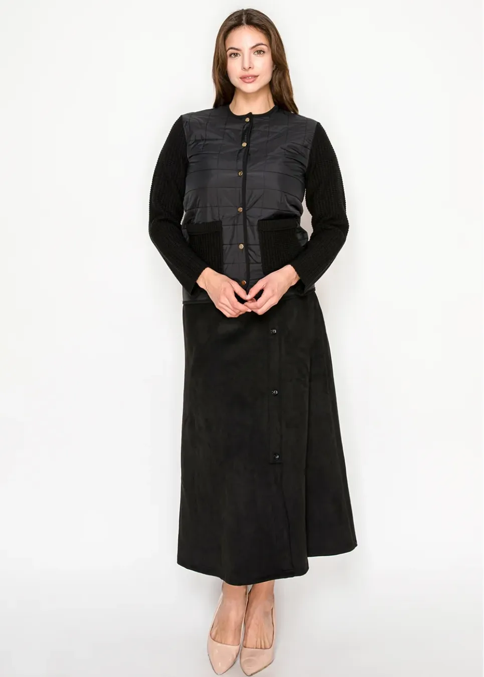 This jacket mixes classic quilted style with chunky knit accents for a fresh, modern take. The curved hem and snap buttons give it an easygoing finish you’ll wear on repeat.