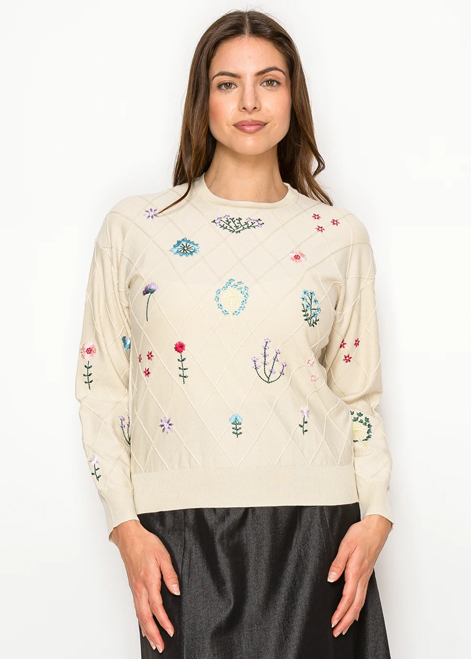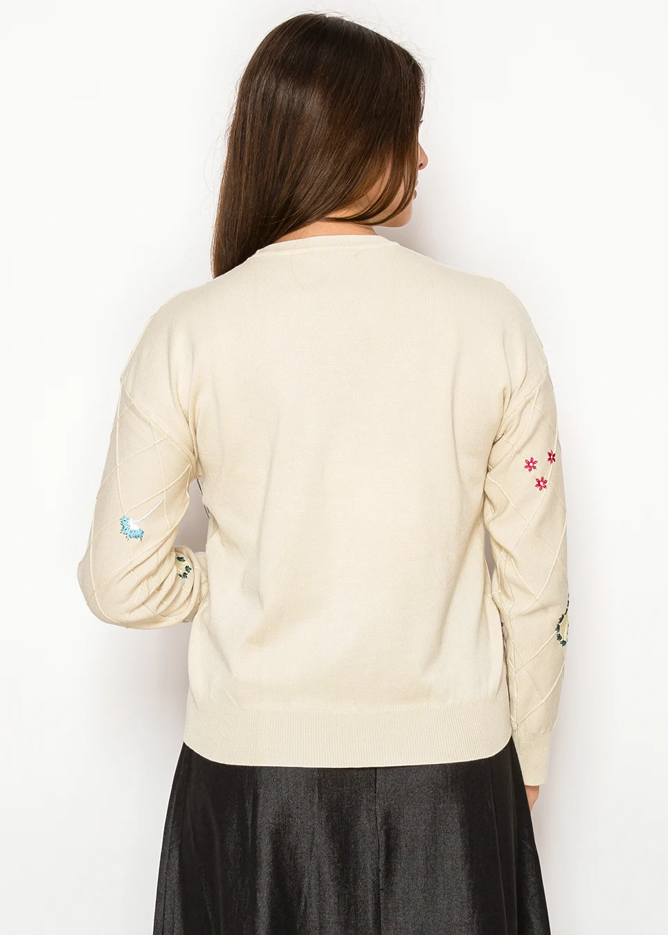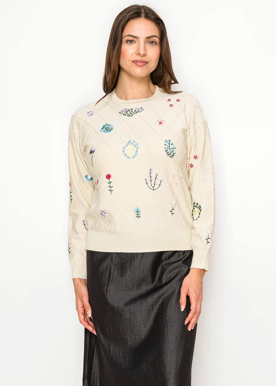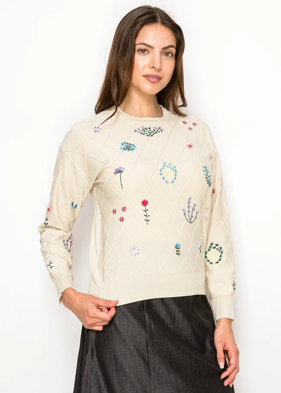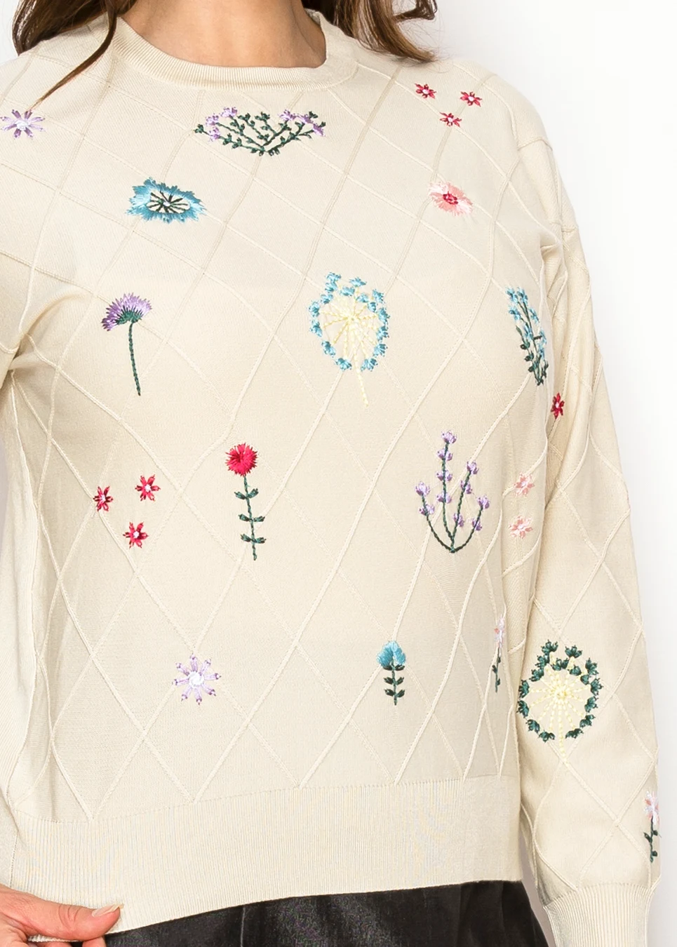 A soft beige knit sweater detailed with scattered floral embroidery across a subtle diamond-textured base. The smooth viscose blend offers lightweight comfort with a polished finish.