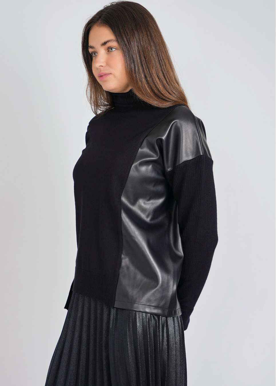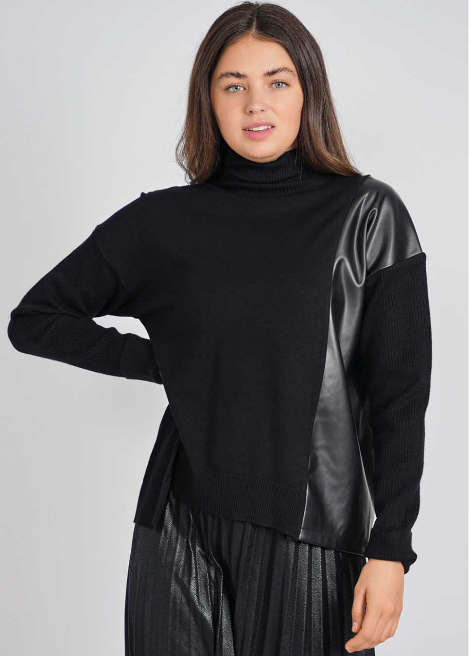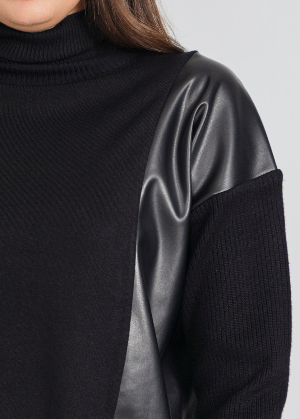 Relaxed Black Sweater with Side Leather Flair