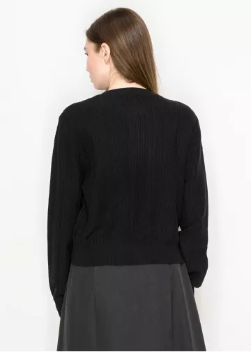 A versatile black cardigan designed with textured knit and contrasting white buttons. Perfect for layering over dresses or pairing with tailored skirts.
