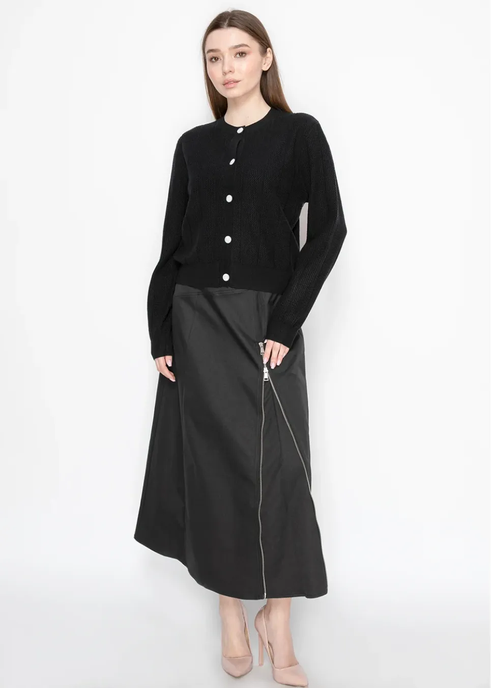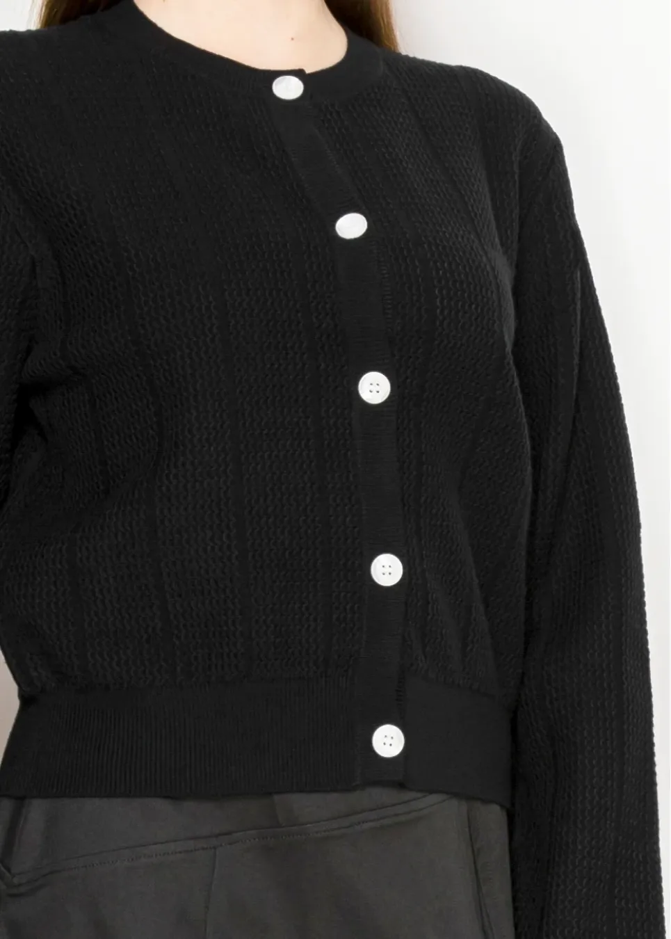 A versatile black cardigan designed with textured knit and contrasting white buttons. Perfect for layering over dresses or pairing with tailored skirts.