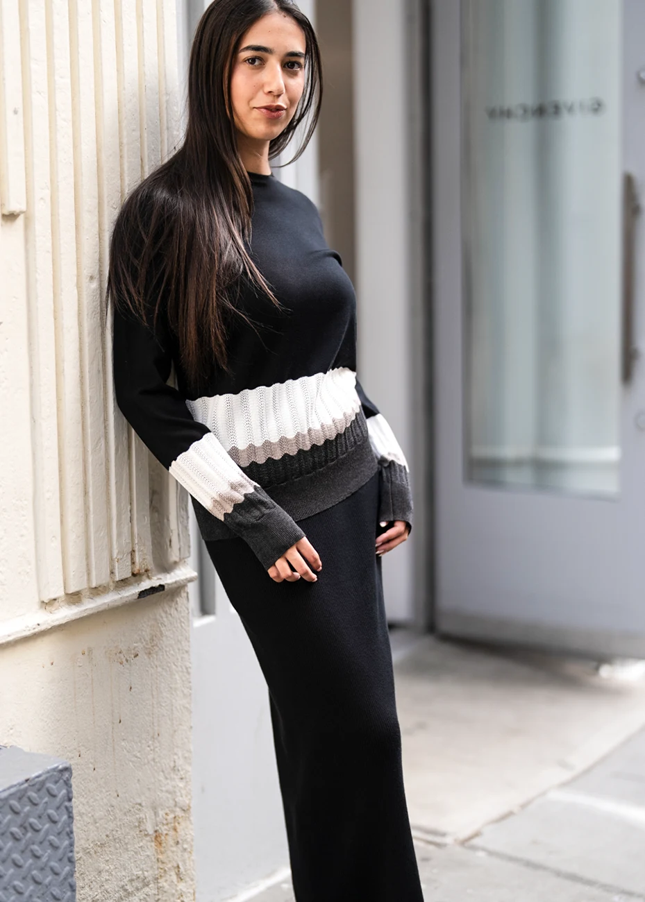 Gentle contrast bands and a soft feel make this knit pairing quietly striking. Perfect for days you want to look polished but stay comfortable.