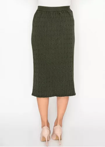 Refined cable knitting and a deep olive shade give this skirt timeless elegance. A versatile midi silhouette designed for effortless sophistication.