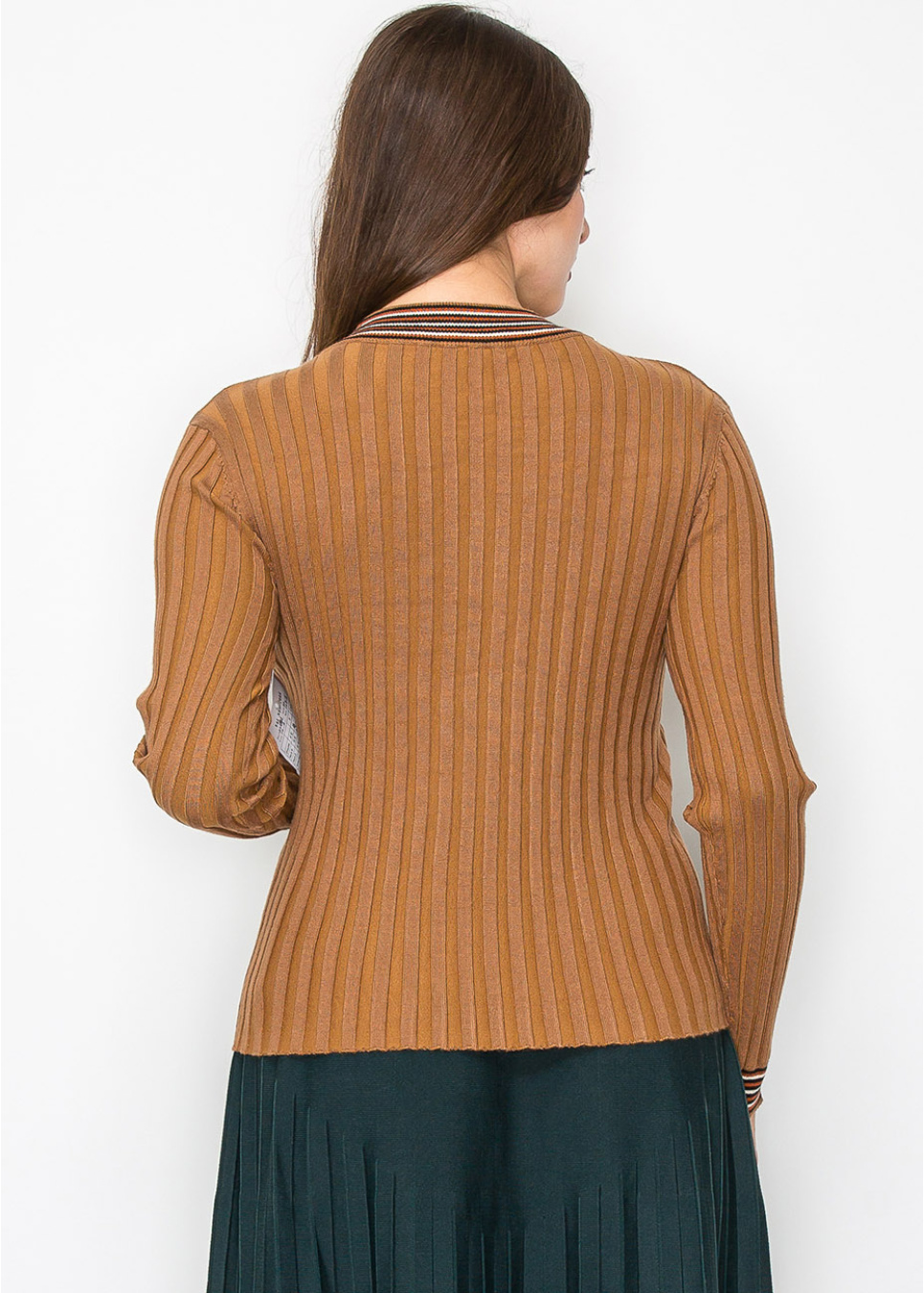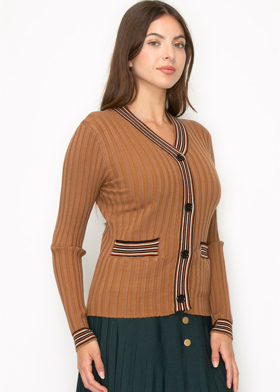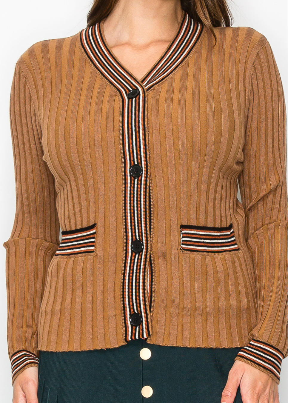 This ribbed camel cardigan features striped details that bring a playful twist to a classic design. The button-up front and ribbed texture provide a flattering fit, while the striped accents at the neckline and pockets add a bit of contrast. It’s an easy, stylish choice for any modest wardrobe.