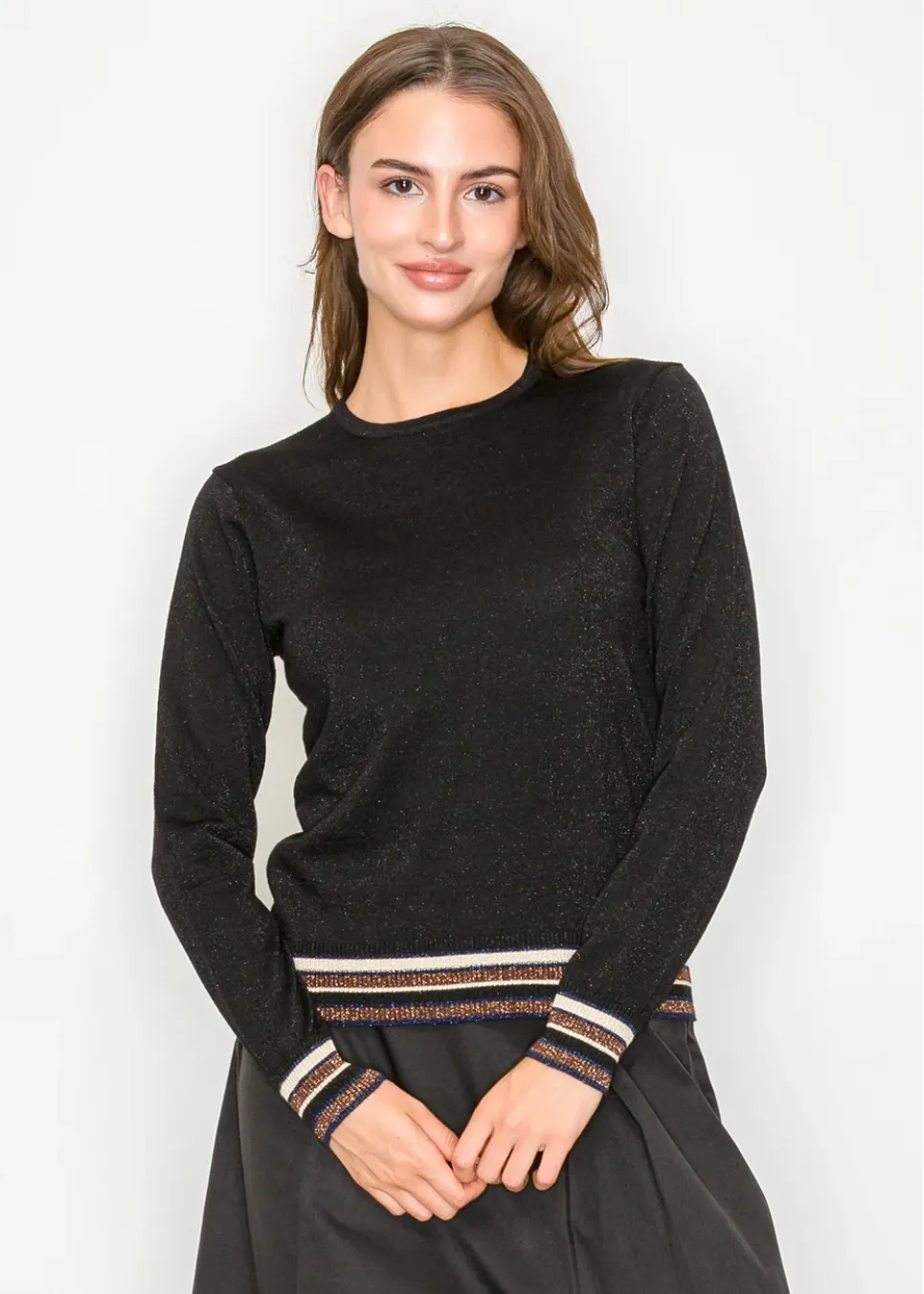 Sleek, simple, with just a little shine. This cozy pullover has sparkling accents woven in and striped hems that elevate your go-to black sweater.