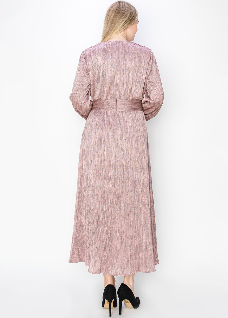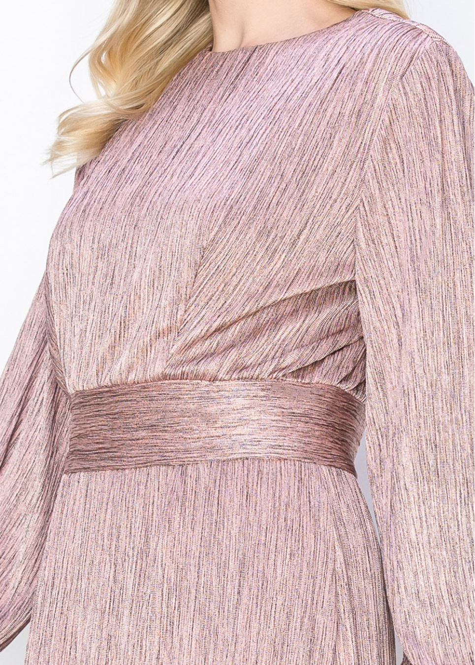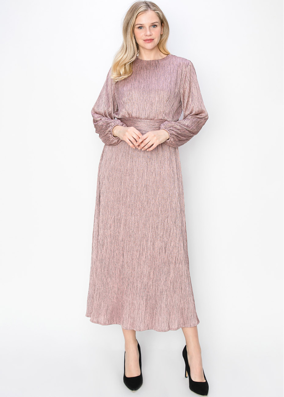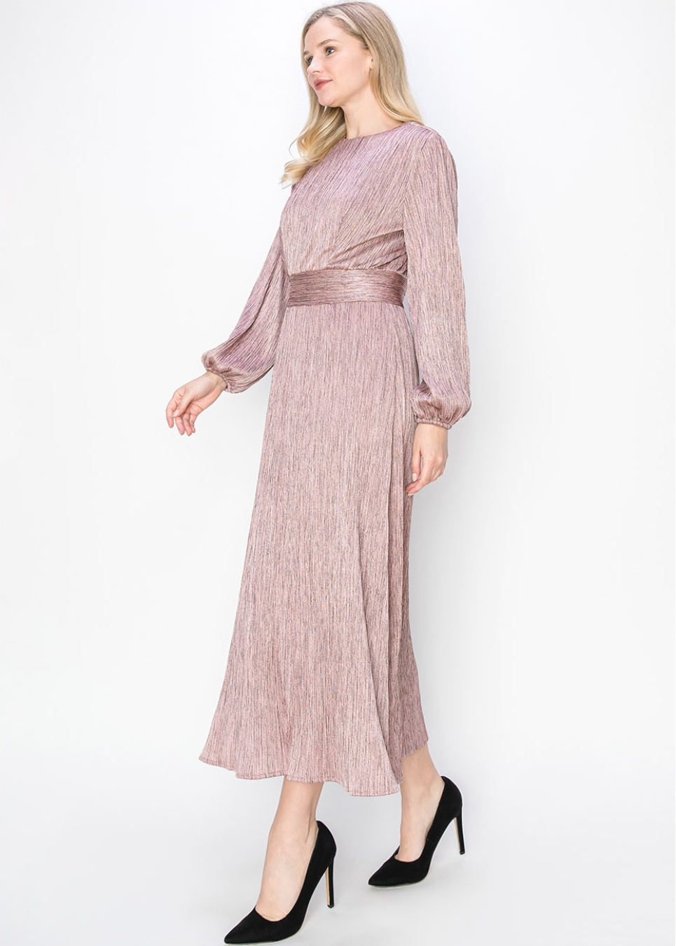 Add a little sparkle to your wardrobe with this blush pleated dress, featuring a metallic sheen that shines in the light. The waist is accentuated with a wide band, creating a beautiful silhouette, while the long sleeves make it perfect for modest wear.