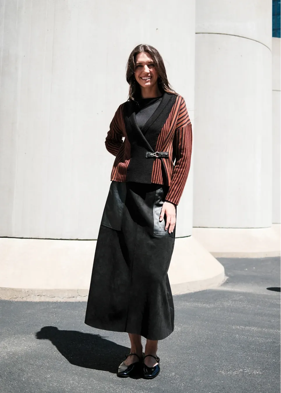 A cozy wrap-style knit meets a soft A-line skirt with faux leather panels, creating a look that’s both feminine and confident.