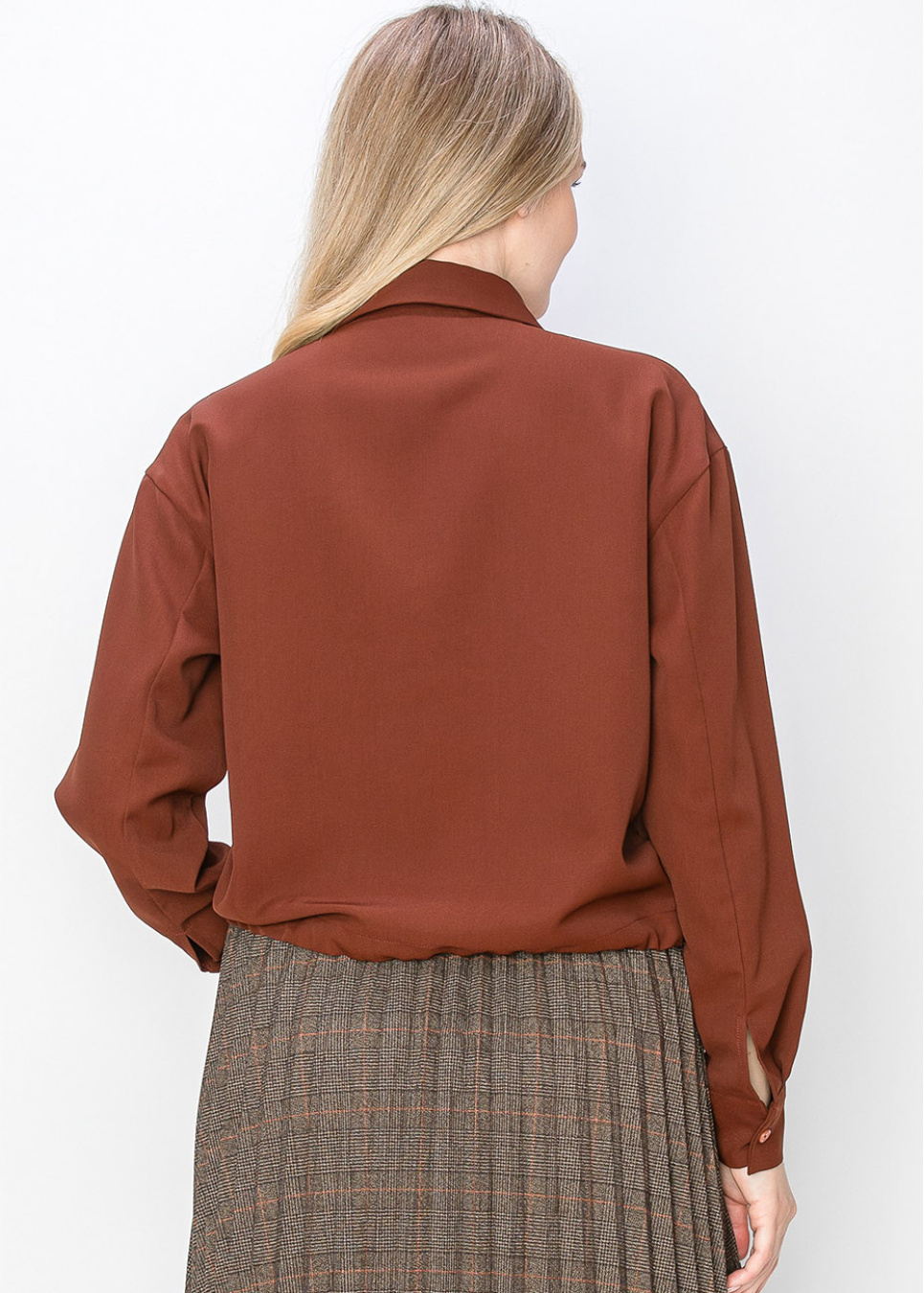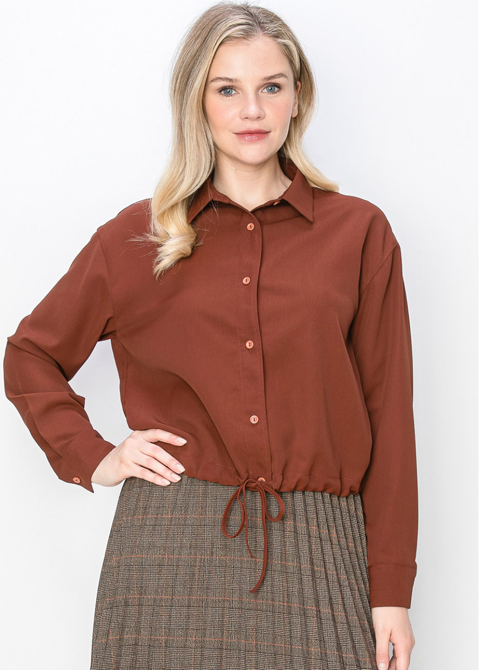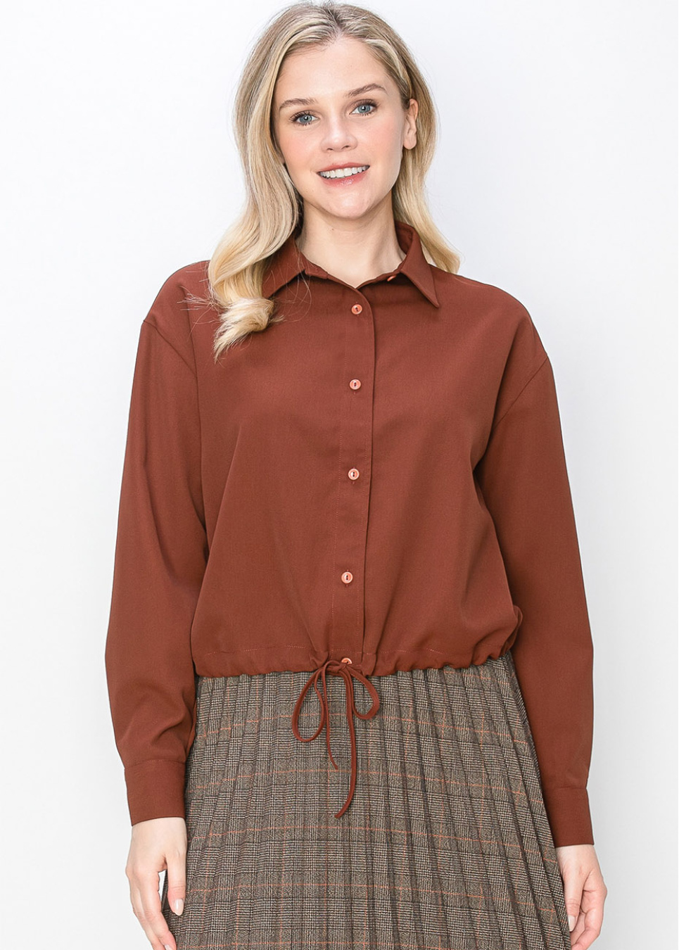Designed in a deep rust color, this shirt combines simplicity with functionality. The button-down front and drawstring waist make it easy to adjust the fit, while long sleeves provide the coverage you need for a modest and refined look.