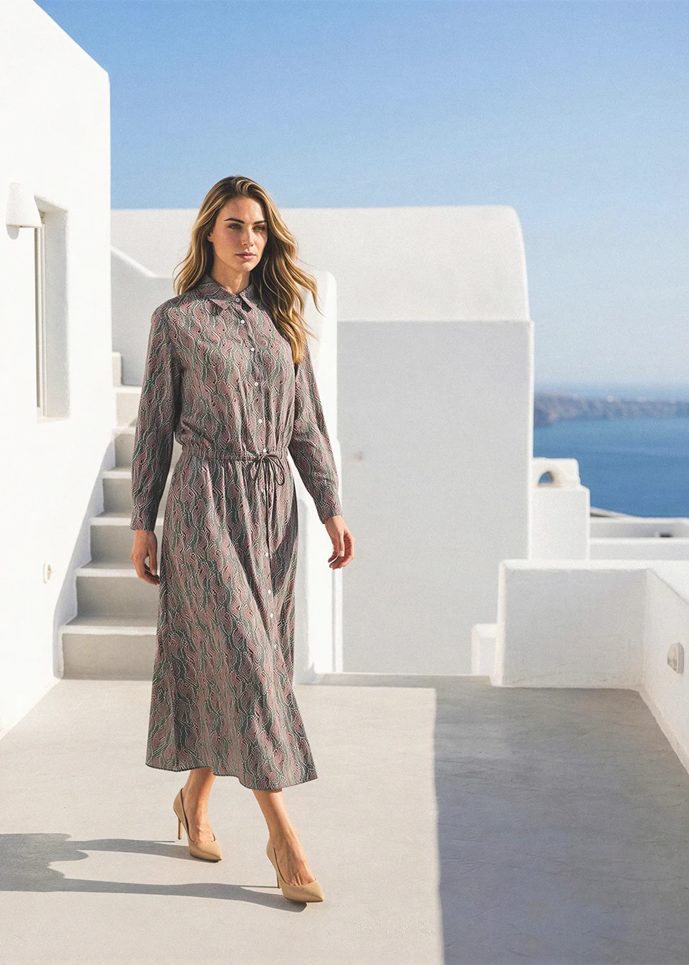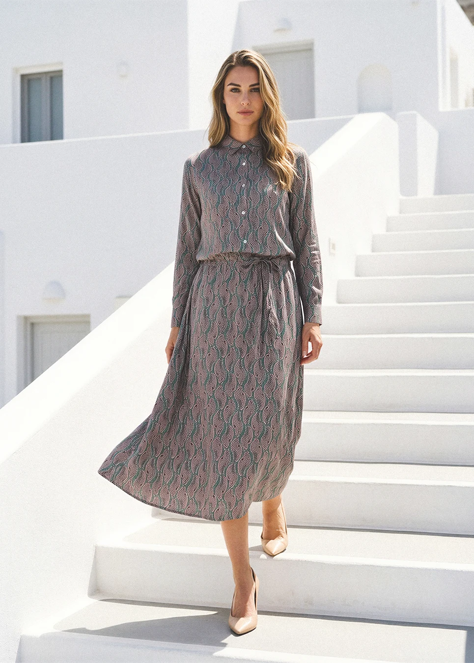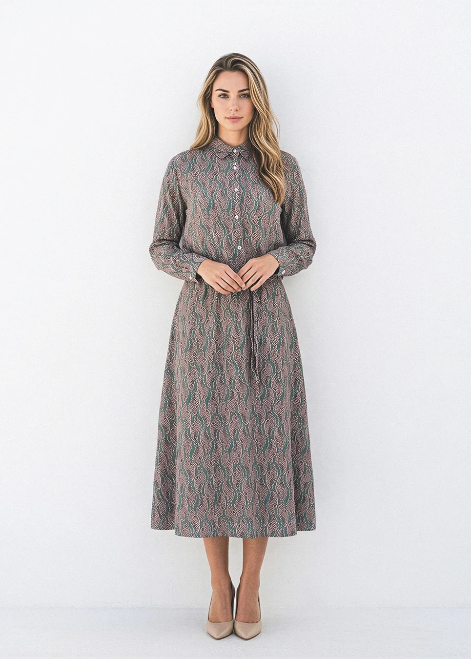 A print set works when the print is interesting enough to carry the whole outfit, and this one is. The sage and rose paisley has depth — it reads differently in sunlight than indoors, and the wave pattern creates a vertical visual line that flatters. Drawstring blouse, full A-line skirt, same fabric weight on both.