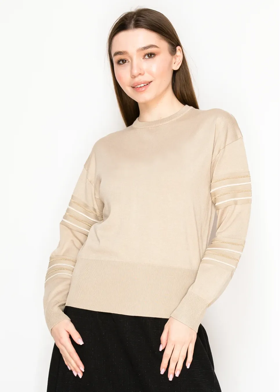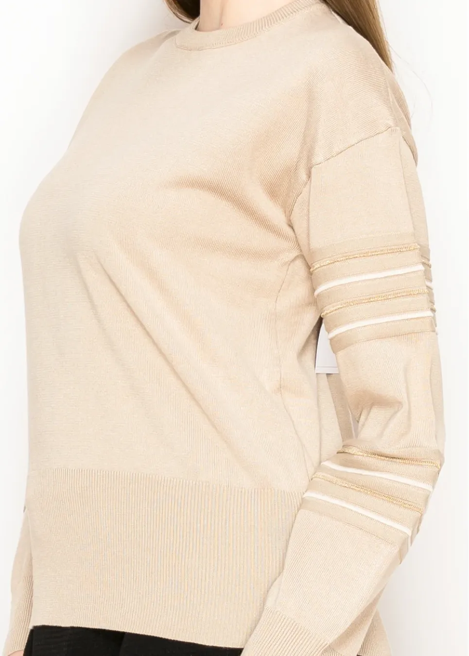 Sand Beige Sweater with Lurex Stripe Sleeves