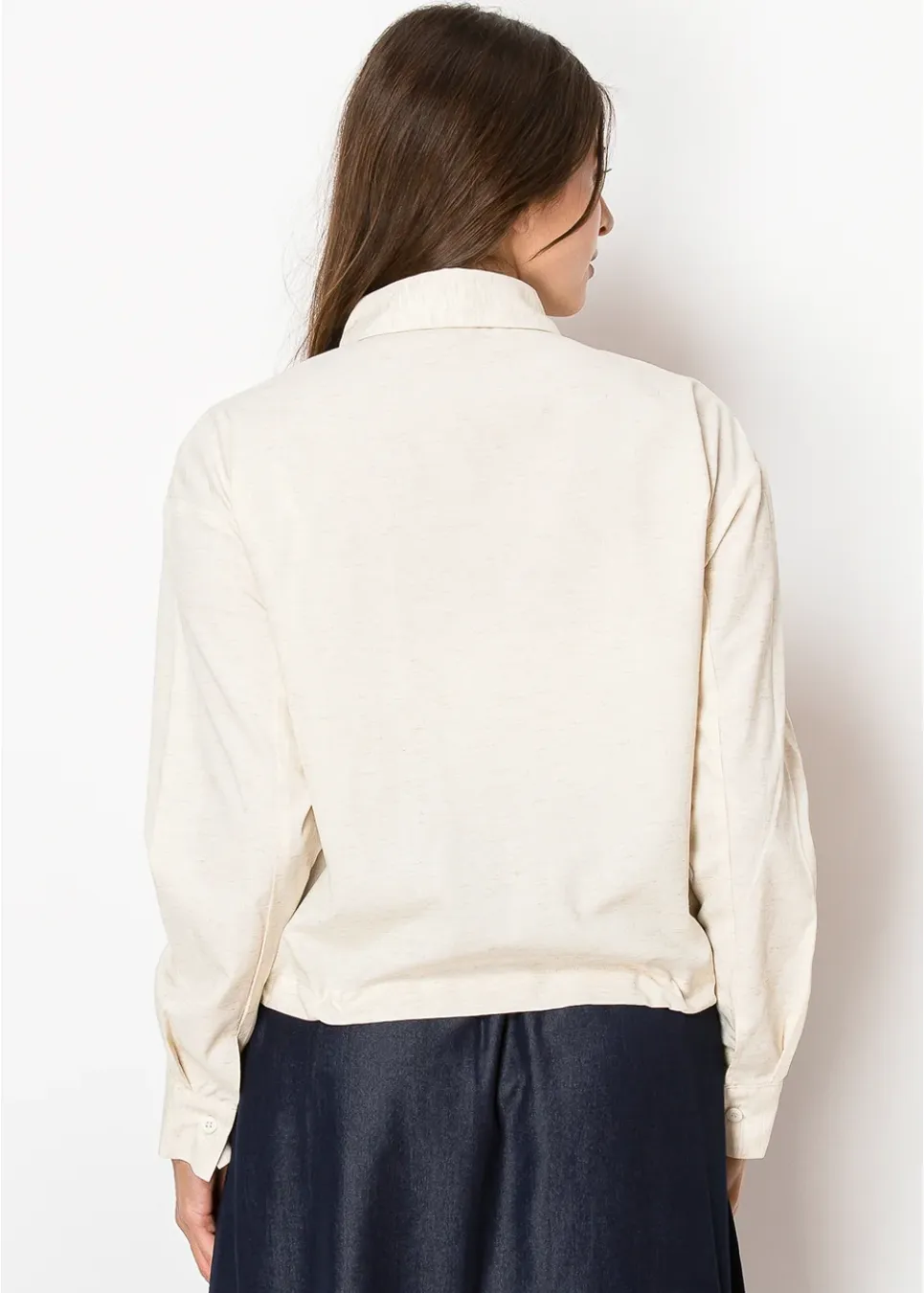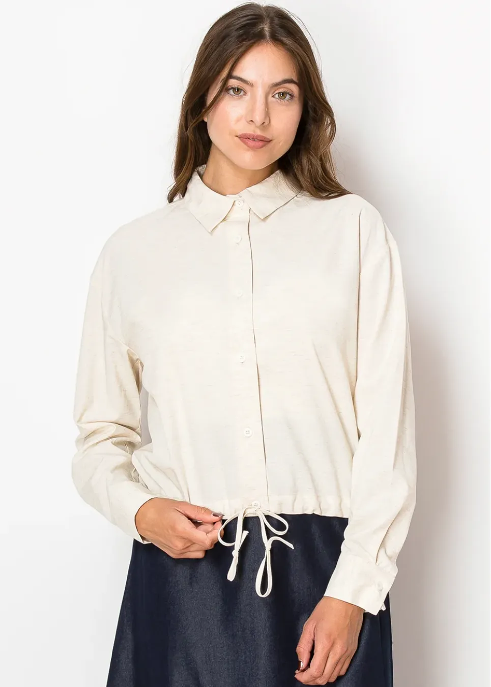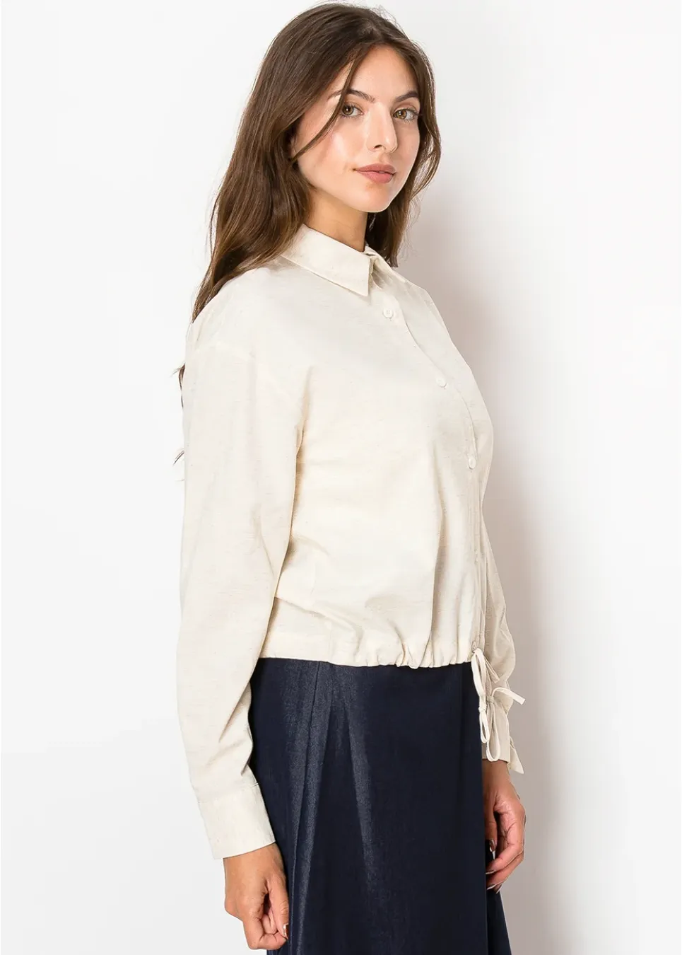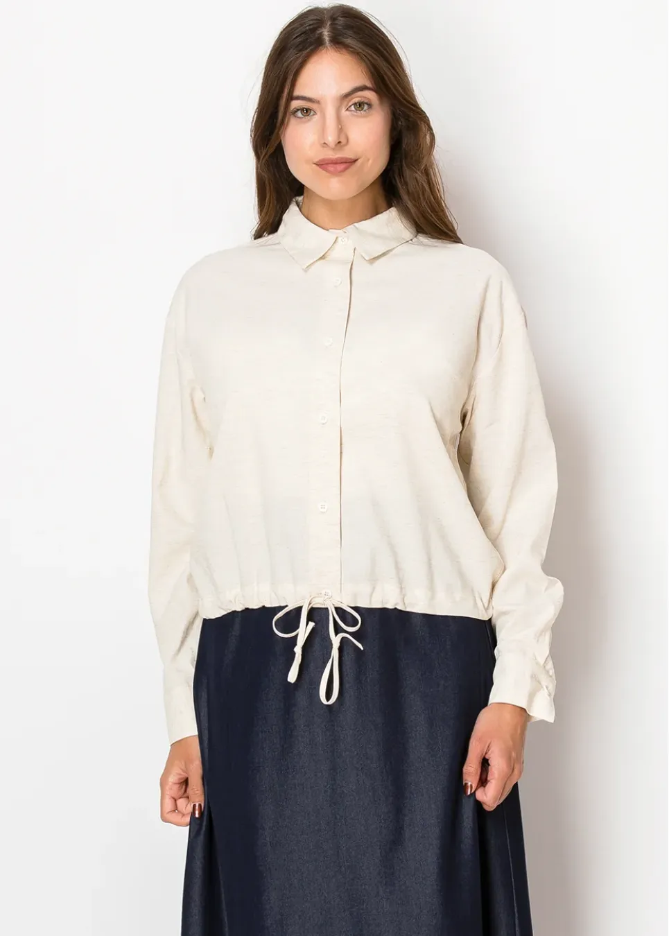 Light and breathable, this blouse features a soft linen-inspired beige color that feels effortlessly natural. With a drawstring waist for a personalized fit and a classic button-up design, it’s perfect for a modest yet modern look.