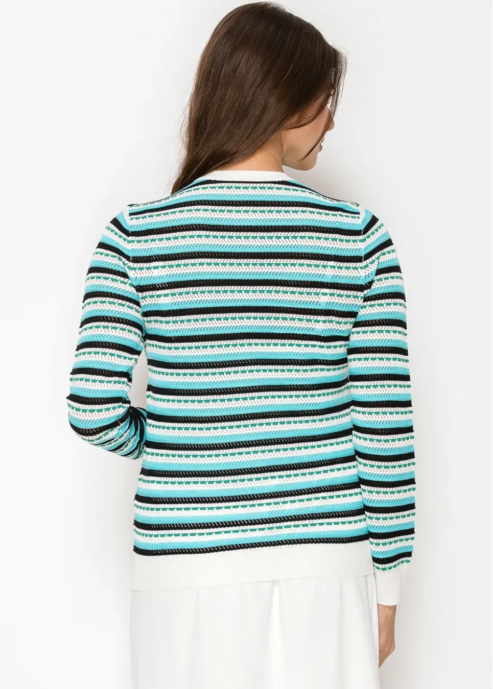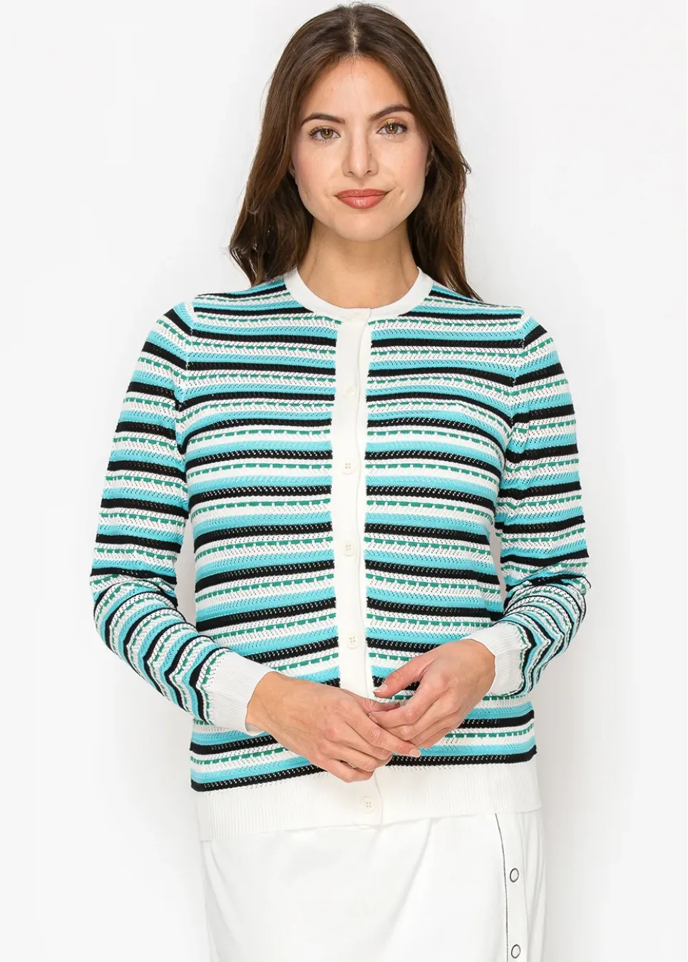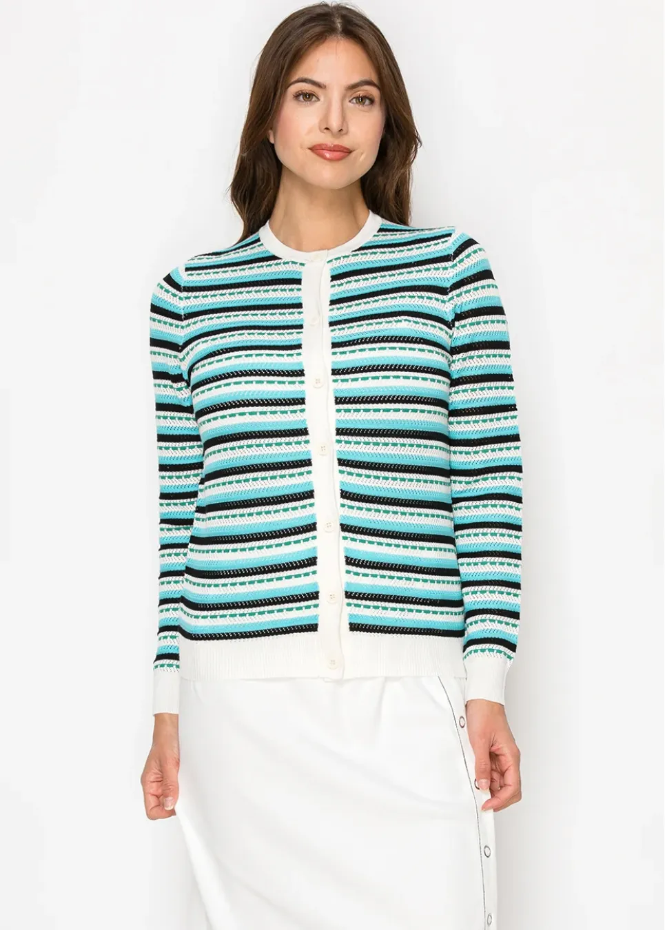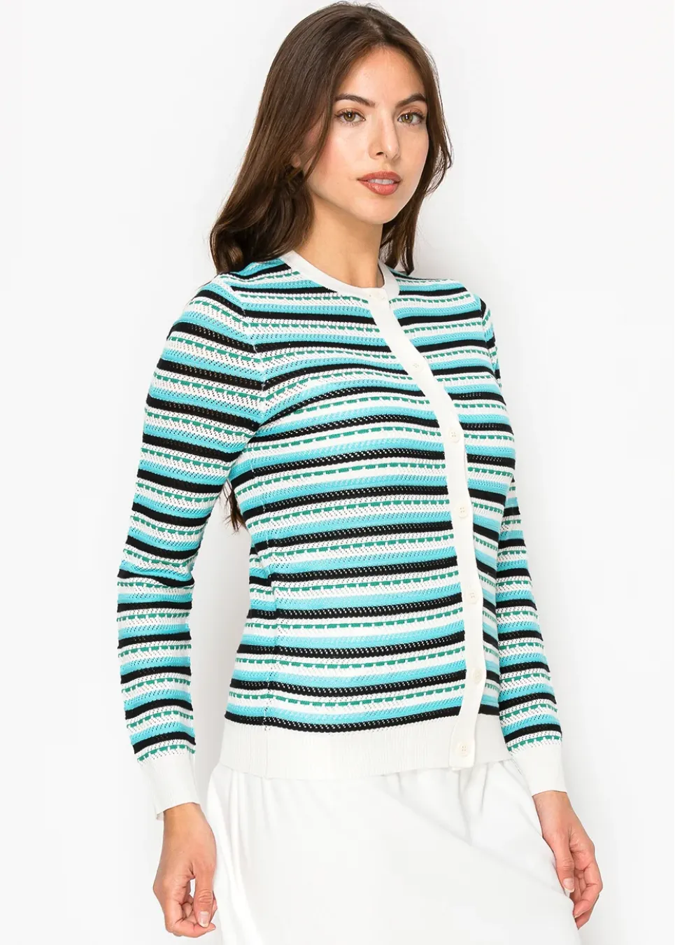 A timeless cardigan with a fresh color mix. The stripes add just enough detail without being too bold, and the button-up design gives you options. Light enough for layering, cozy enough for everyday wear.