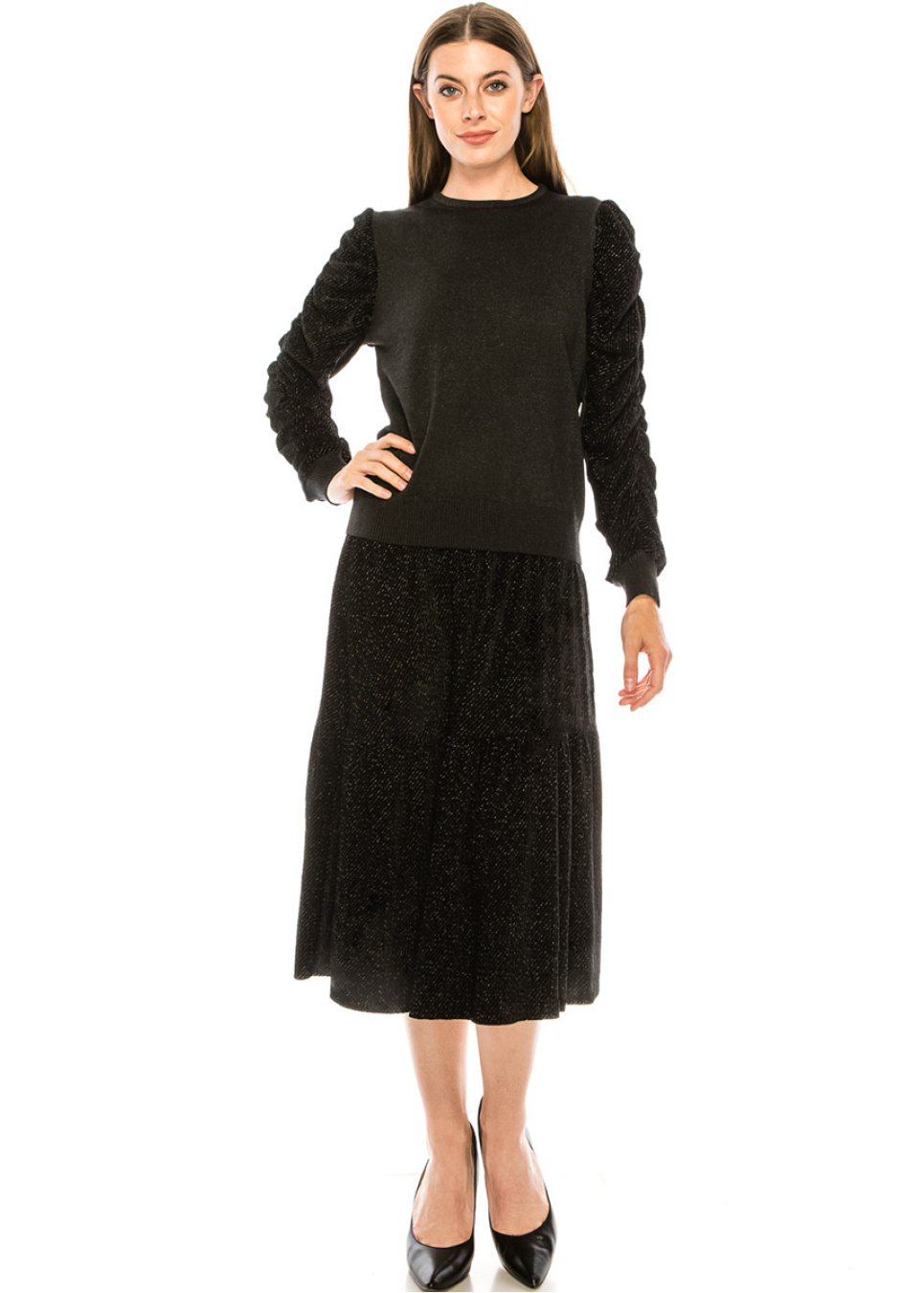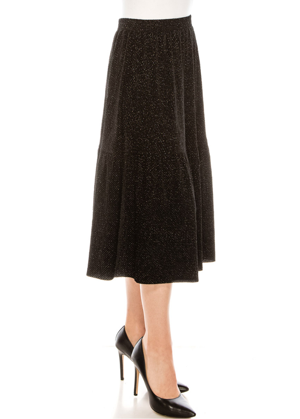 This skirt is a definition of a classic with a glam touch. It features a timeless design, flattering shape, rich velvet texture, and shiny sequins. High-quality fabric and elastic waistband make it warm and comfy.