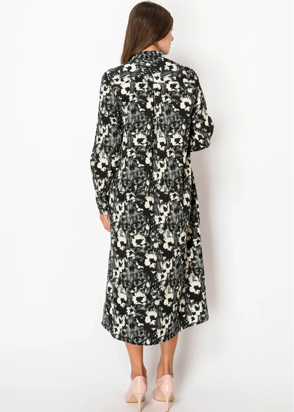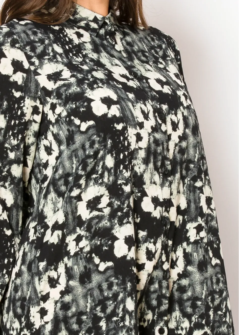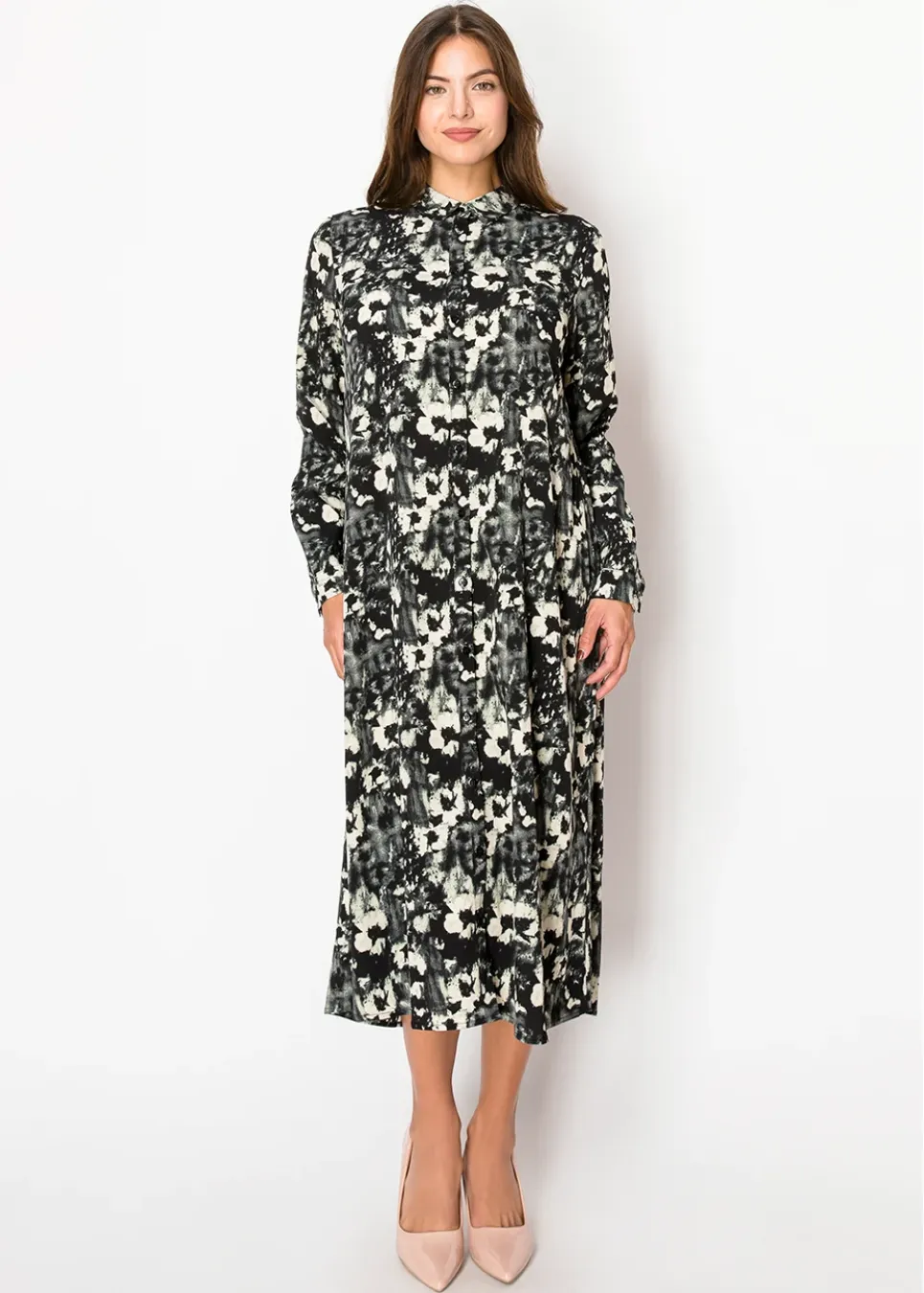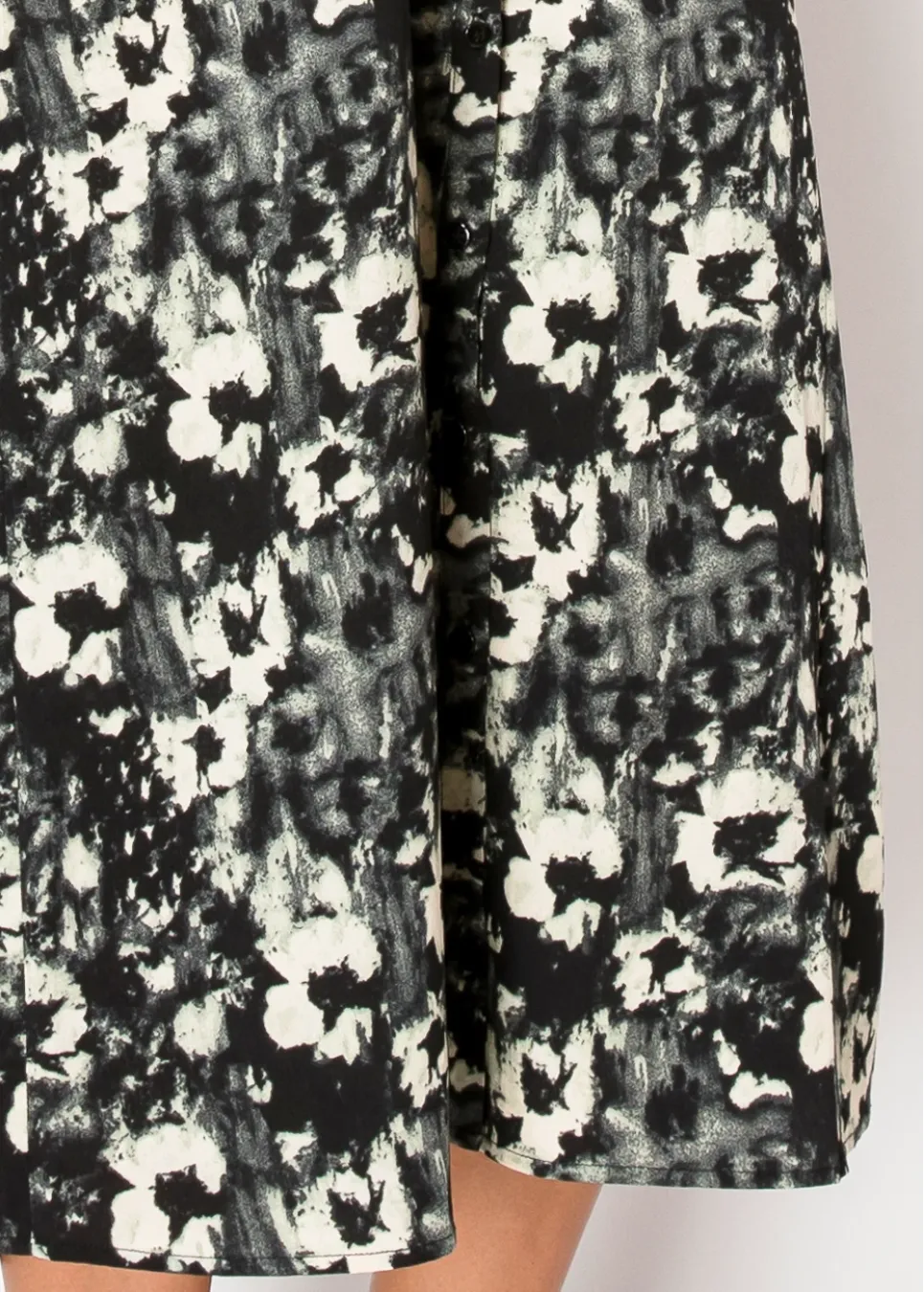 Delicate florals meet bold black tones in this effortlessly chic dress. The abstract print adds a touch of drama, while the flowy fit and collared neckline make it a piece you’ll keep reaching for.