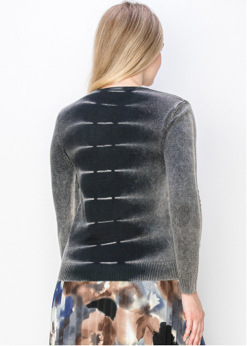 This black sweater features a subtle gradient stripe pattern that creates a soft, shadow-like effect. The smooth knit fabric ensures comfort and warmth, while the understated design adds a modern touch. It’s perfect for pairing with skirts or layering for a cozy, modest look.