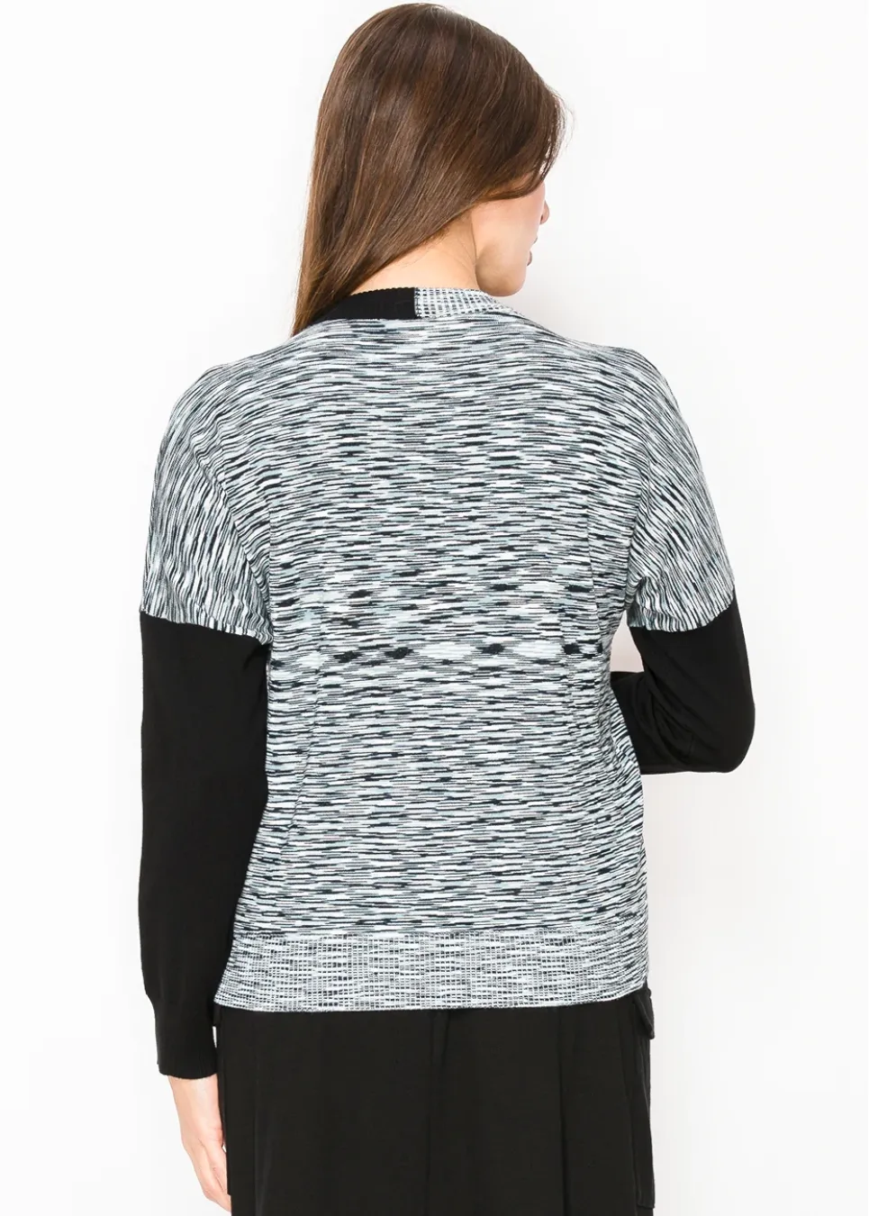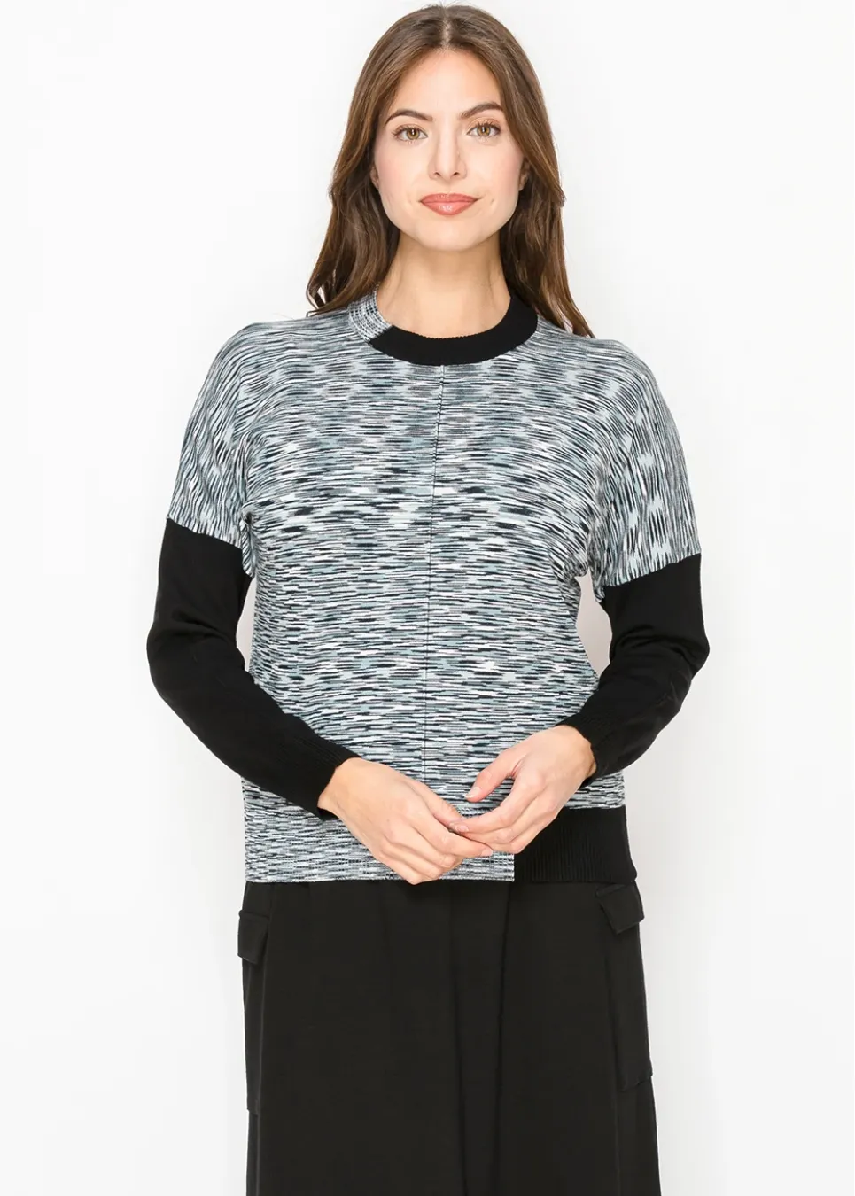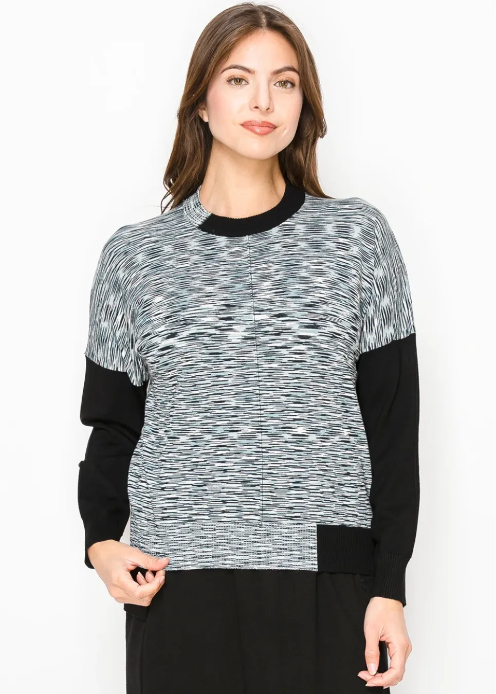 This knit sweater plays with texture and contrast, combining a streaked black-and-gray pattern with solid black sleeves for a balanced look. The soft knit makes it cozy without being bulky—perfect for a polished yet relaxed outfit.