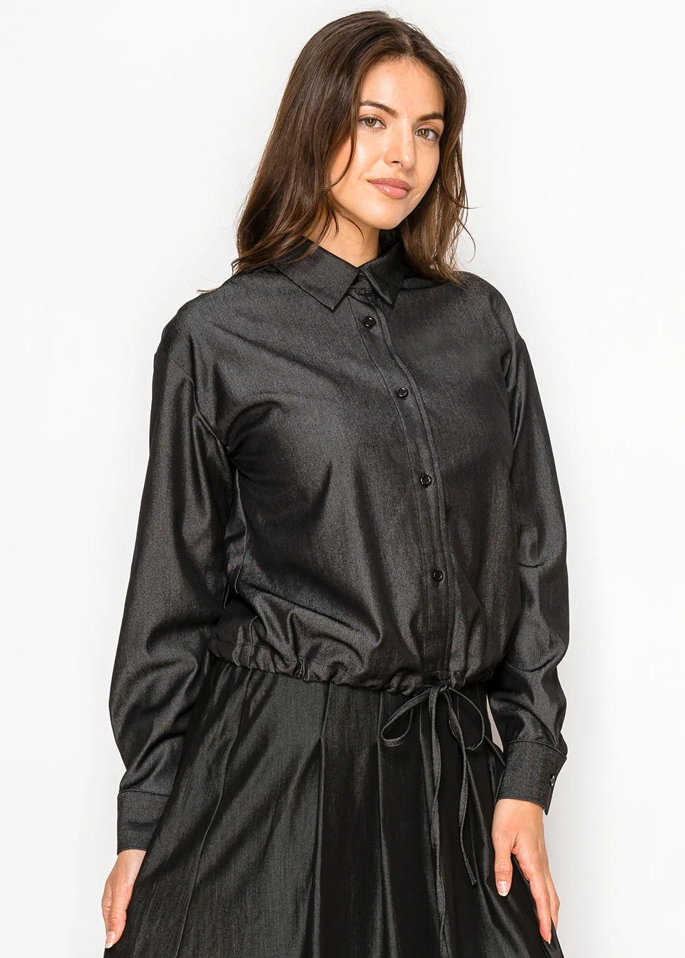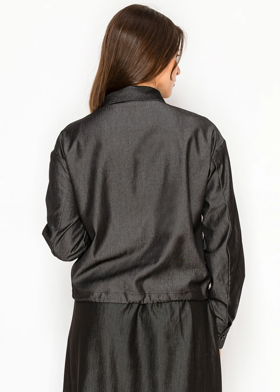 Black long-sleeve shirt jacket with cuffed hem