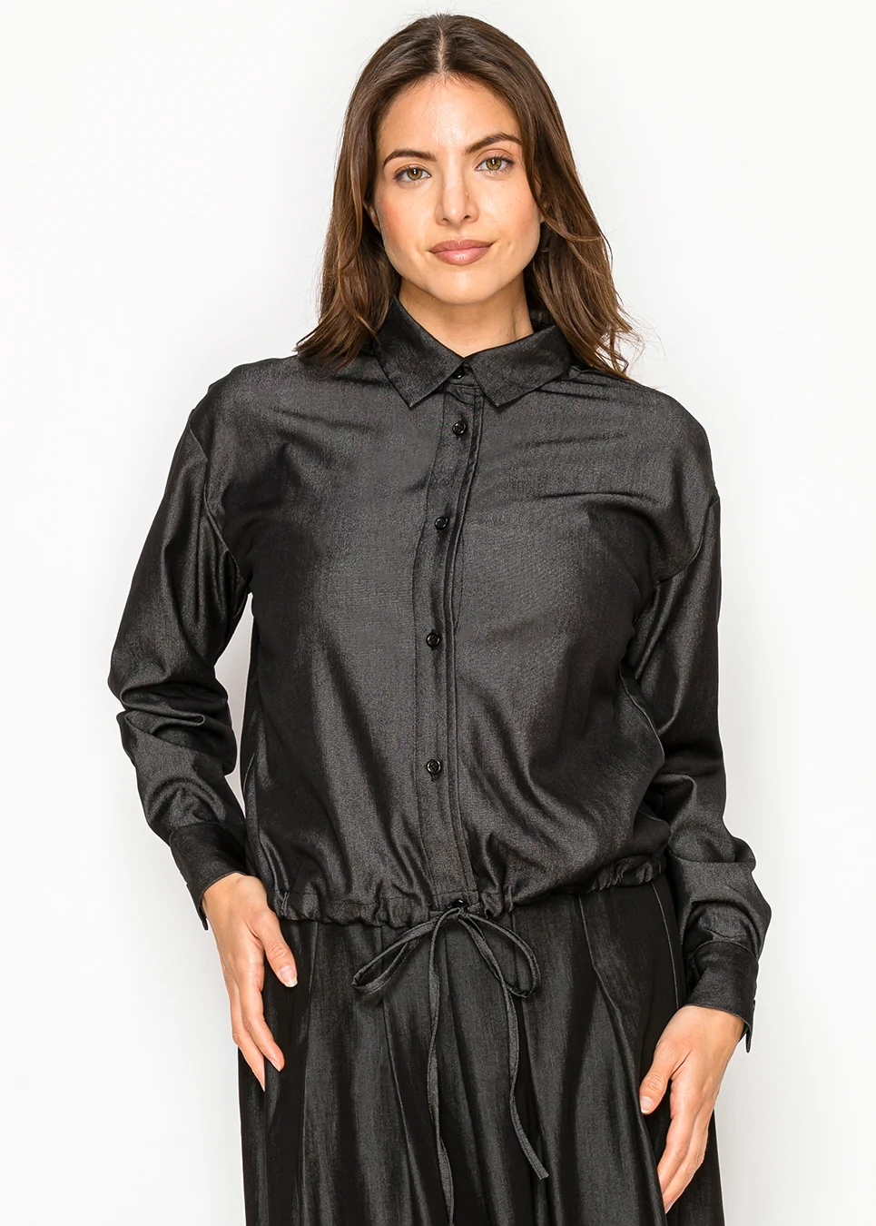 There’s something about a deep black blouse done right. This one combines a crisp collar with a fluid body and subtle stretch, so it moves with you rather than against you. The adjustable waist detail allows you to tailor the fit while maintaining full coverage and polish.
