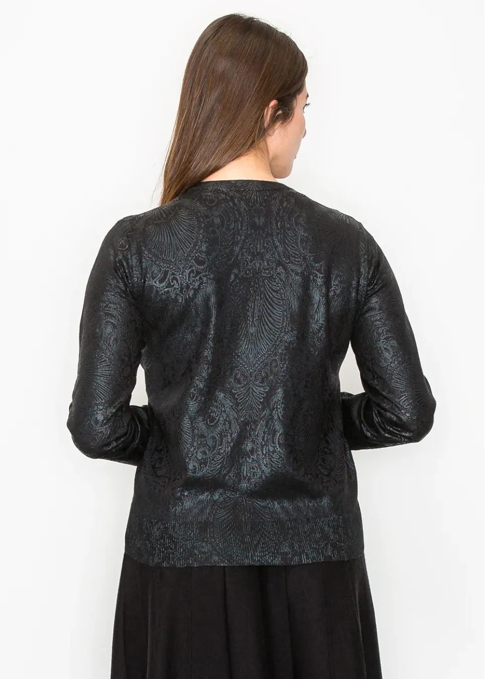 This is the kind of black sweater that surprises you — simple at first glance, but the luminous finish makes it special. It’s an easy way to add a touch of elegance to casual outfits or evening looks.