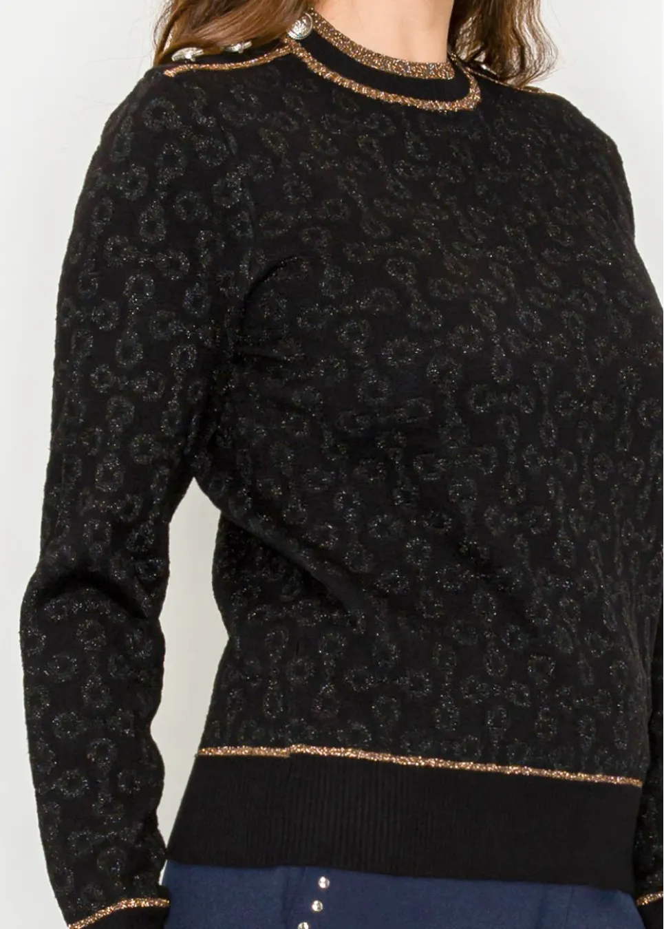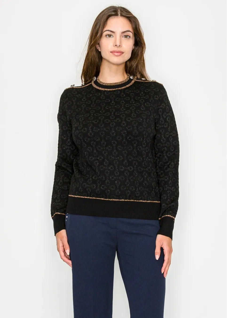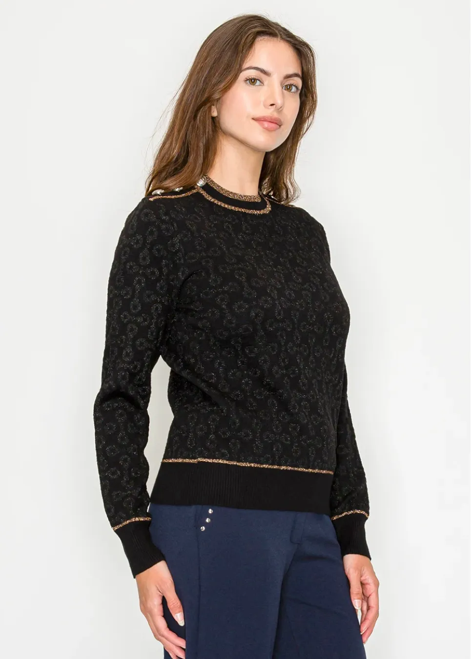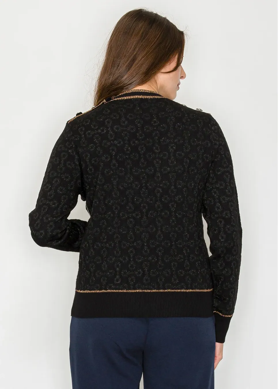 An elegant black jacquard sweater, accented with refined metallic trim for understated sophistication. Designed to bring a hint of shimmer to timeless knitwear.