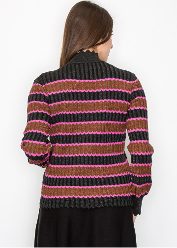 Add some fun to your outfit with this playful striped sweater. The alternating colors of pink and brown on a black backdrop make a bold statement, while the ribbed knit ensures a snug yet comfortable fit. The scalloped neckline and sleeves give this piece a little extra flair.
