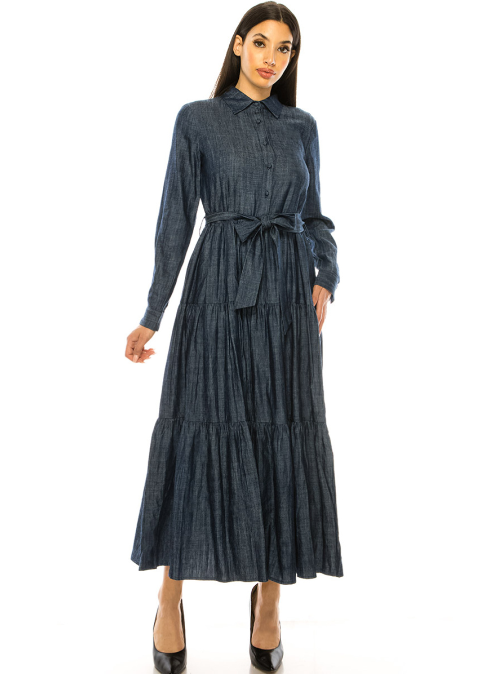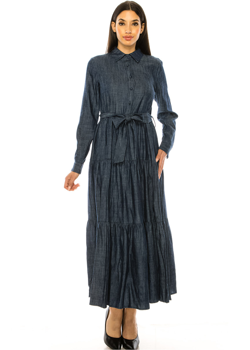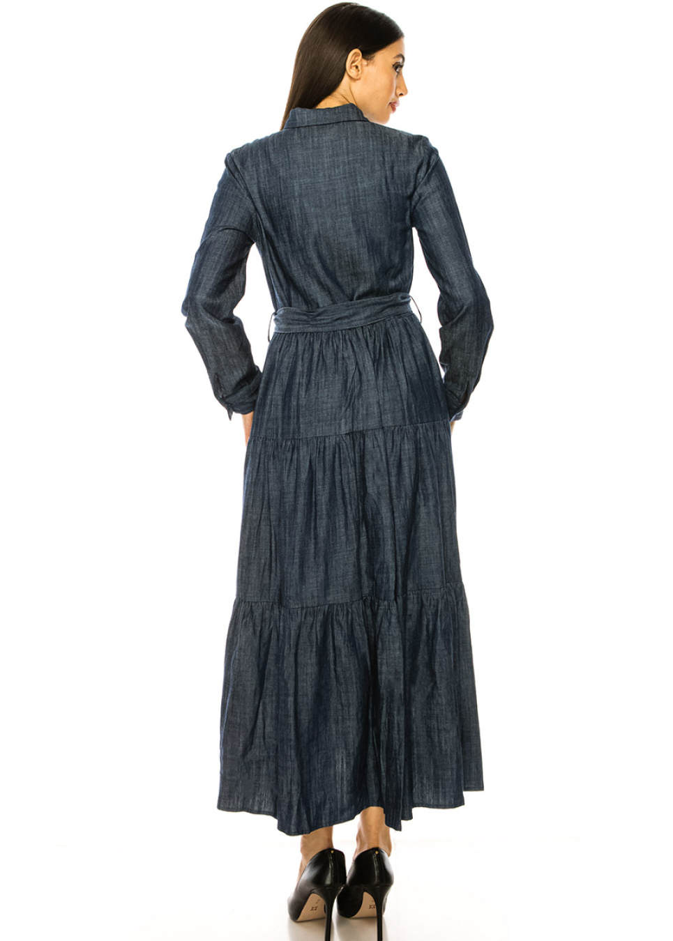 This navy denim maxi dress with a shirt collar and waist belt is a timeless piece that you'll wear for years to come. The dress features a 53' style that adds a vintage-inspired look to your outfit, while the waist belt creates a flattering silhouette. Made from lightweight denim material, it's comfortable and easy to wear. Dress it up or down depending on the occasion, this versatile dress is sure to become a staple in your wardrobe.