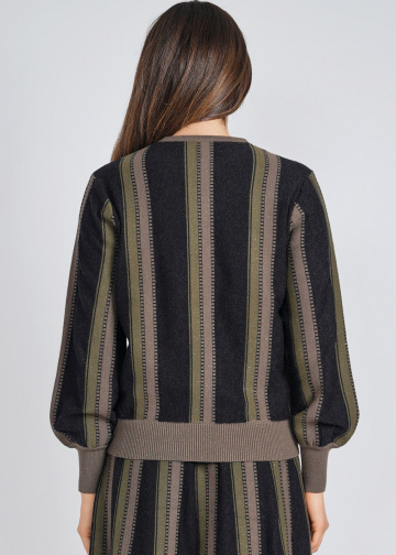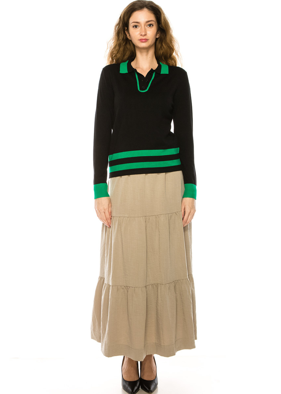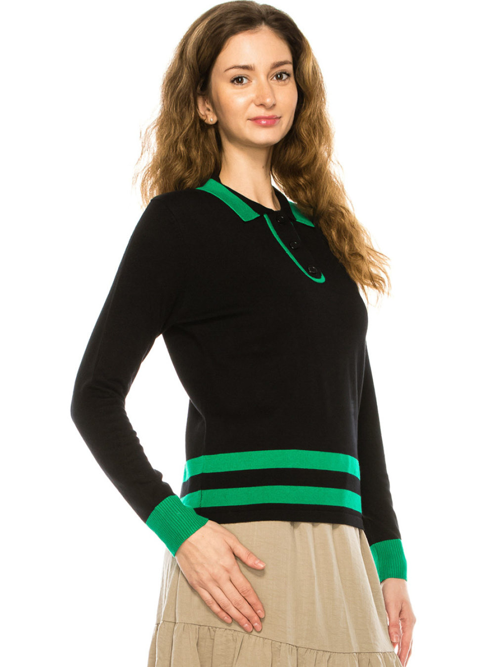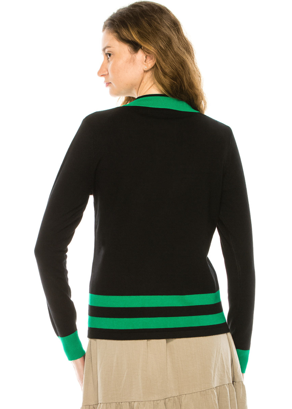 If you're looking for a statement piece to add to your wardrobe, this black sweater with green trim and a shirt collar is a must-have. The bold color combination and classic design make it a versatile piece that can be dressed up or down, making it perfect for any occasion.
