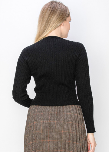 Embrace simple elegance with this black cable-knit sweater. The fitted cut and classic design make it easy to pair with any outfit, whether you’re heading to the office or out for a casual day. Soft, comfortable, and effortlessly stylish—this sweater has it all.