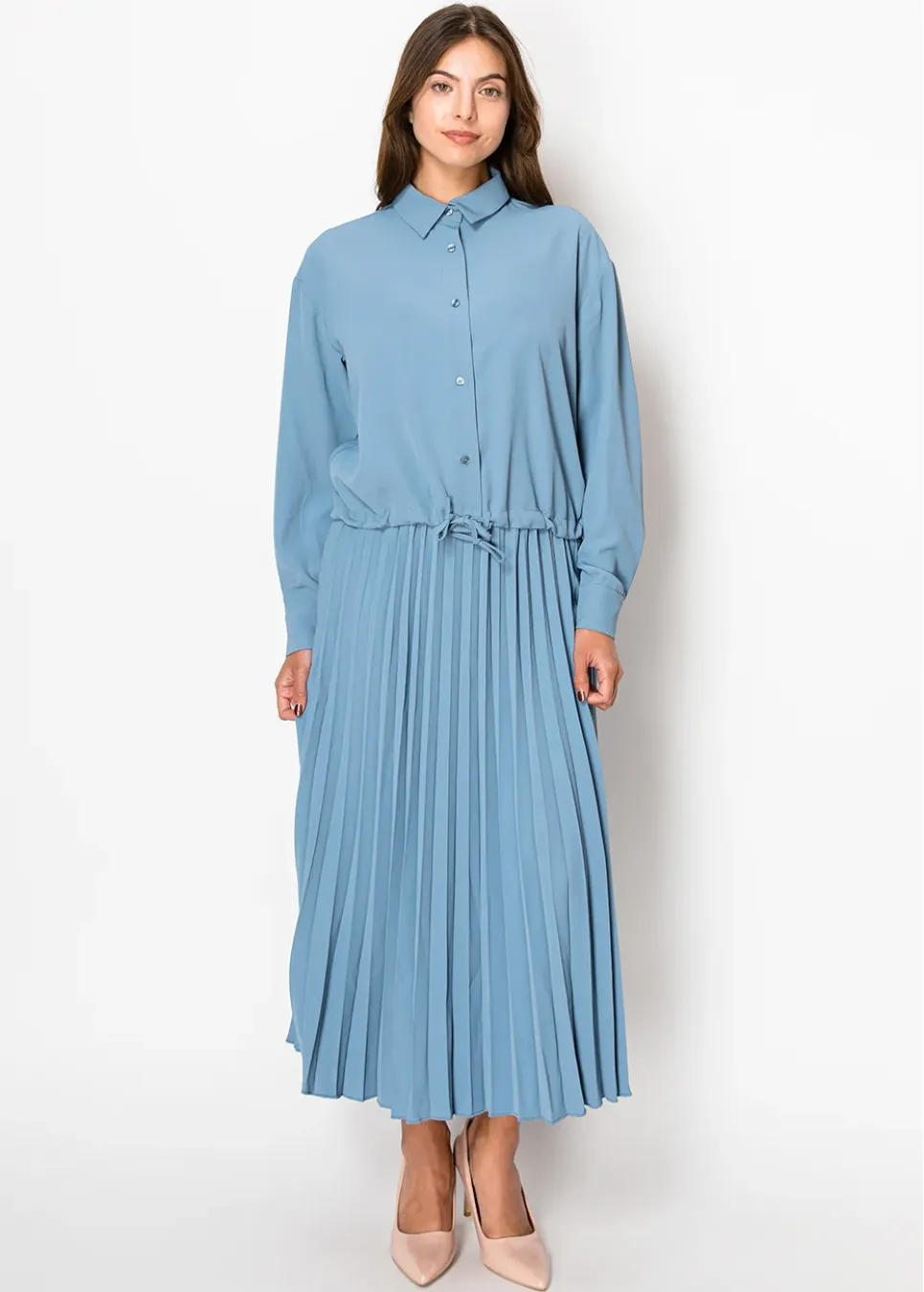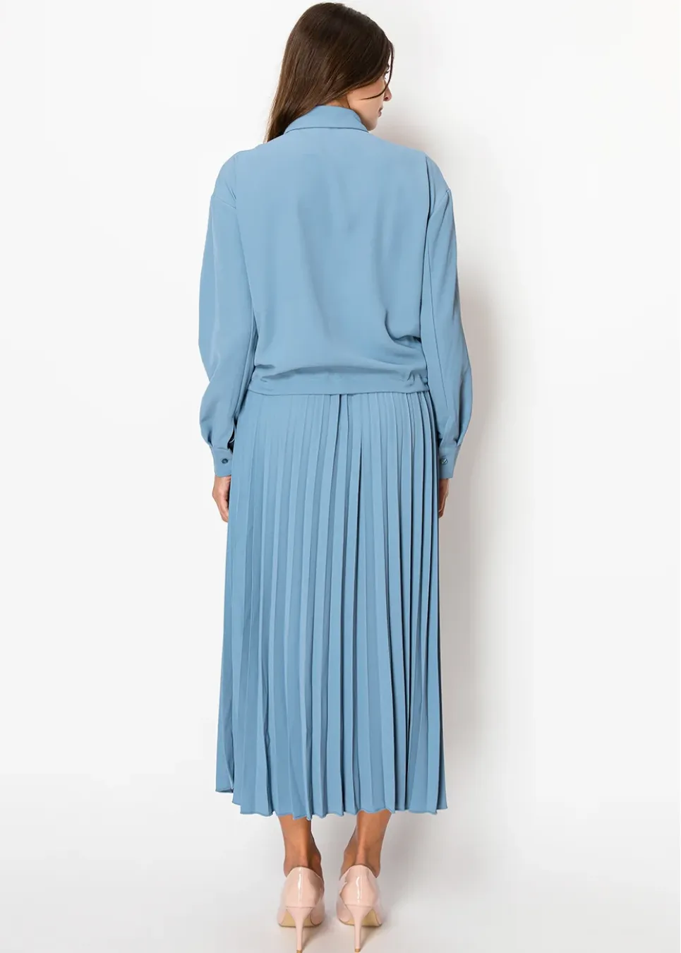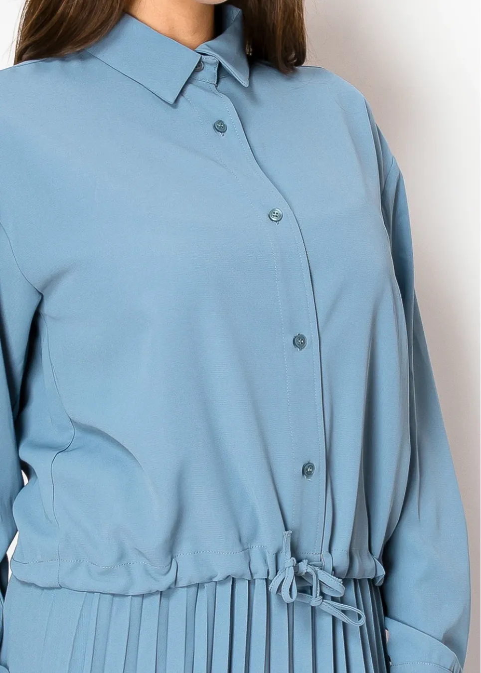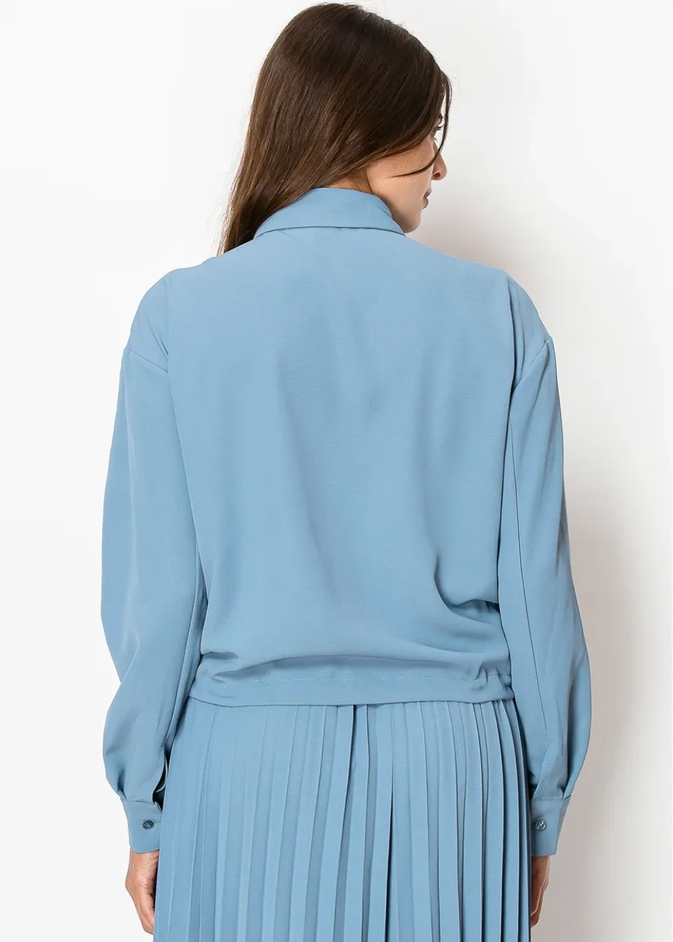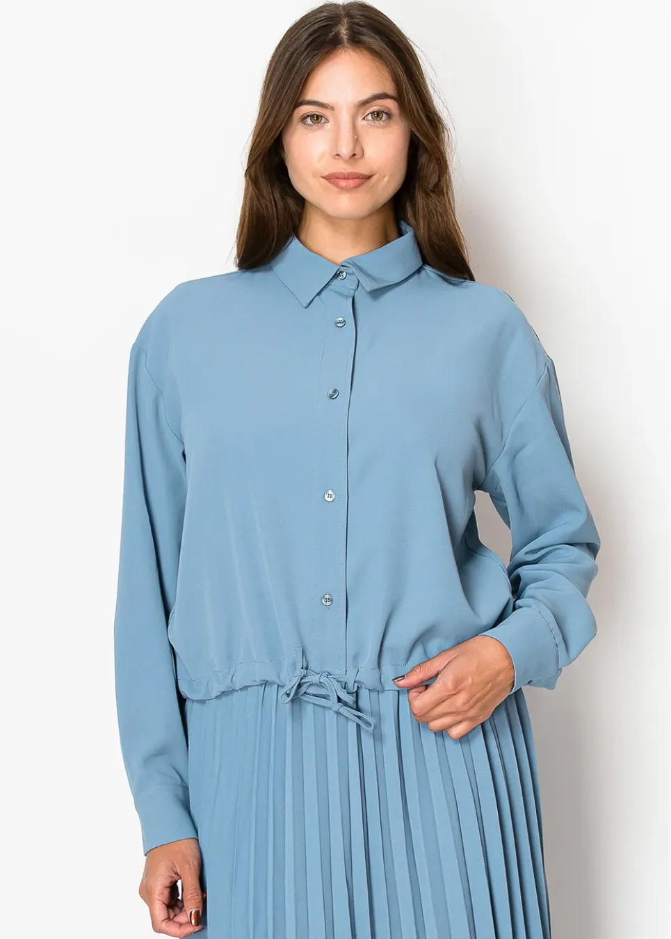 Light as a cloud, this blouse in soft blue is designed for comfort and style. The adjustable tie waist lets you create the perfect fit, while the button-up design keeps it sleek and versatile.