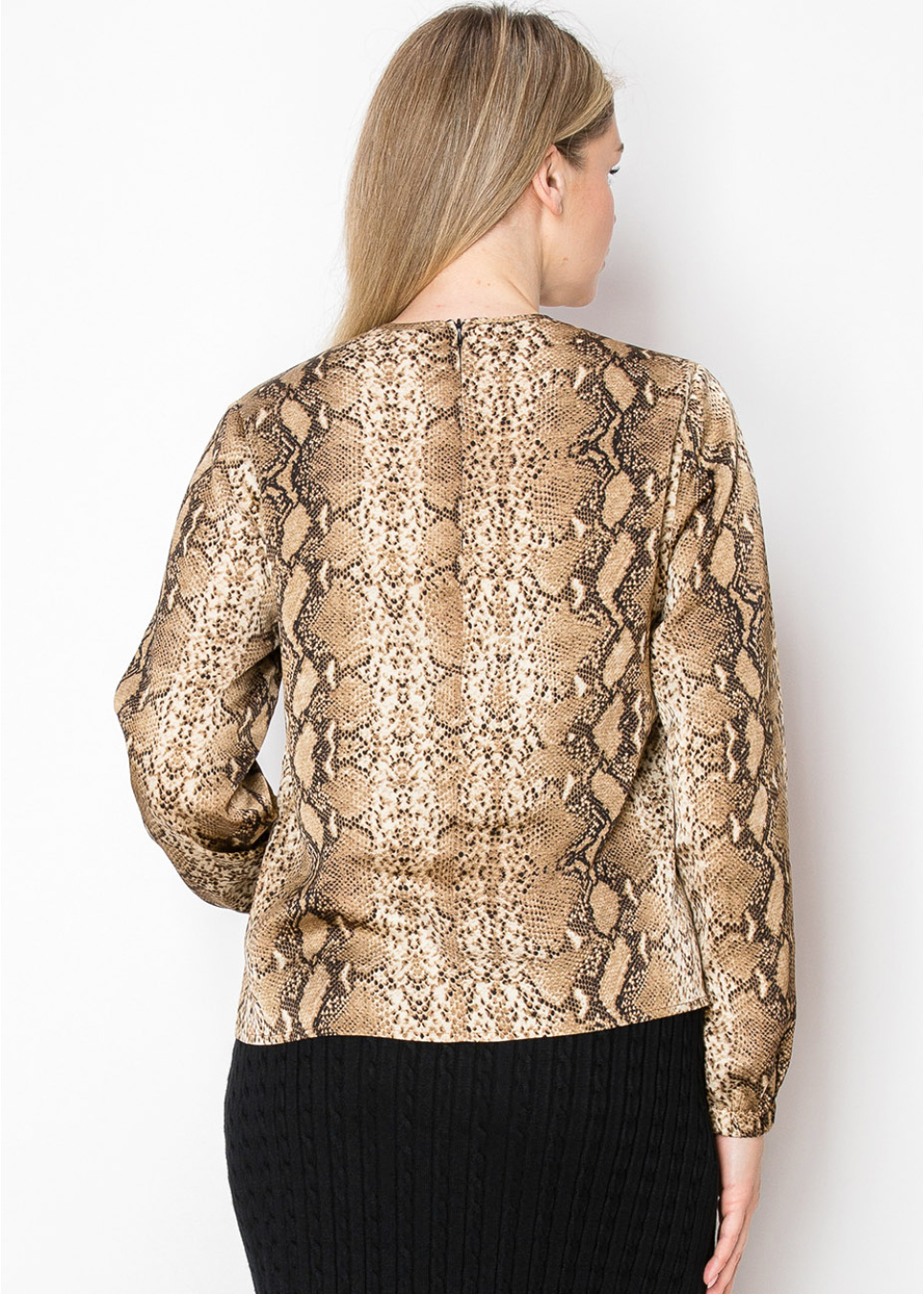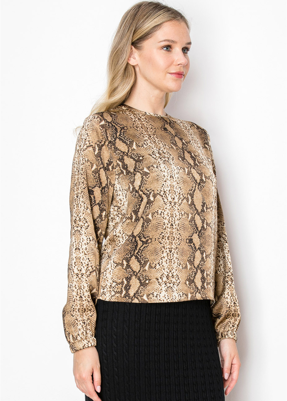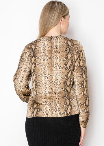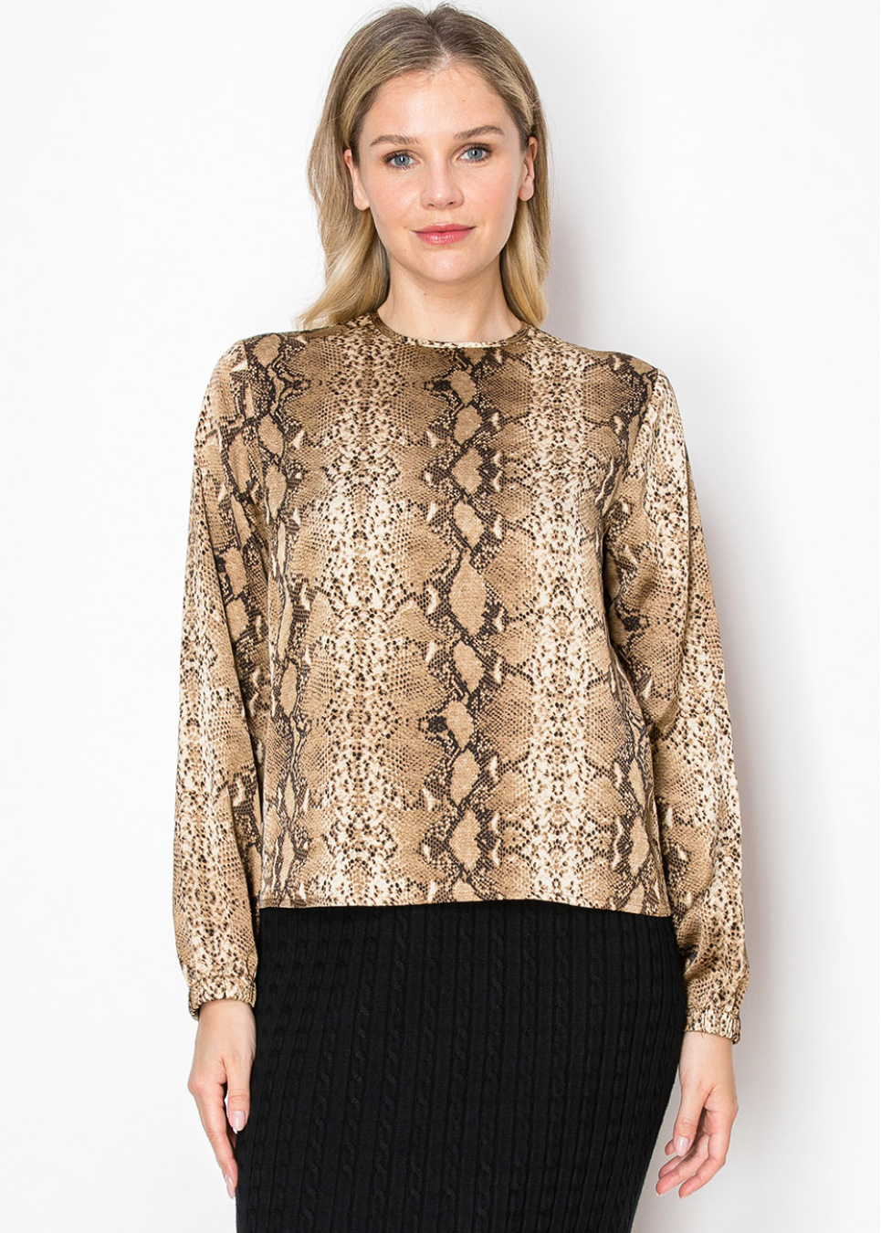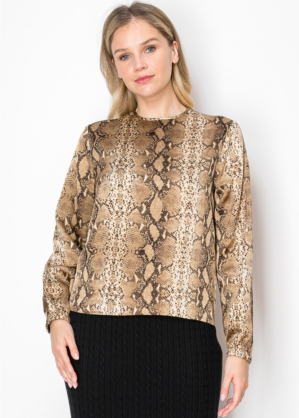 This long-sleeve top brings a bold and modern touch to any outfit with its rich snake print. The relaxed fit and classic round neckline make it an easy piece to wear, perfect for a modest yet stylish look. Pair it with a solid skirt for a balanced, polished appearance.