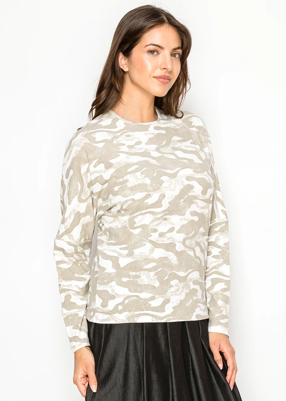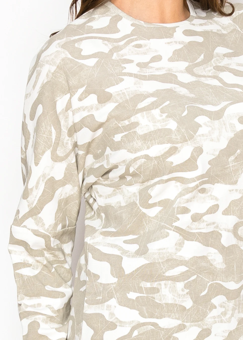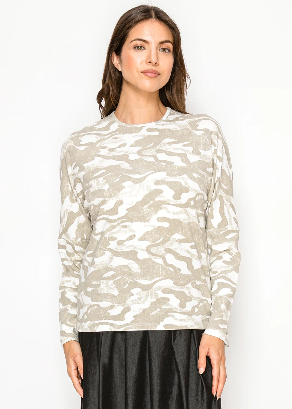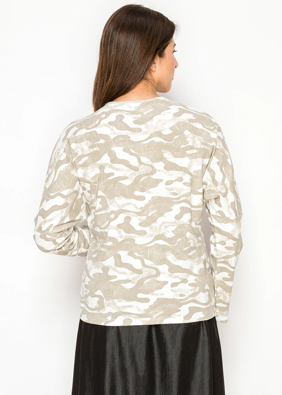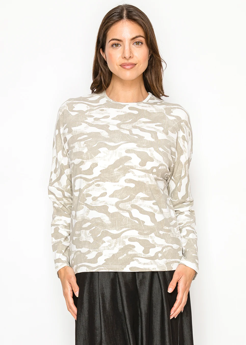 Not your typical camo. The soft neutral tones keep the pattern calm and wearable, while the cotton blend feels smooth and breathable. It’s the kind of long sleeve tee that adds interest to an outfit without making it feel busy.