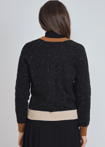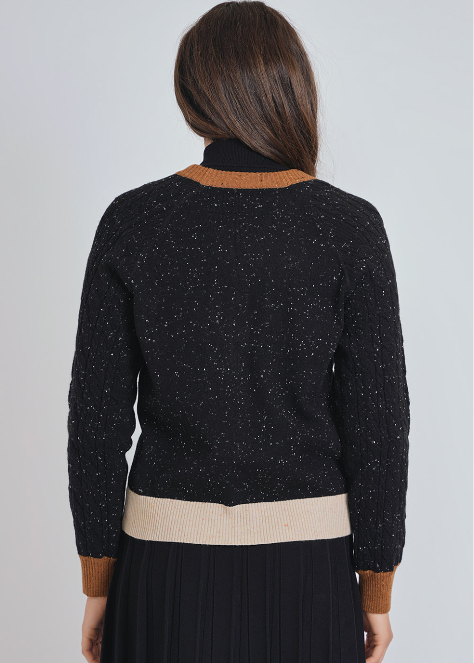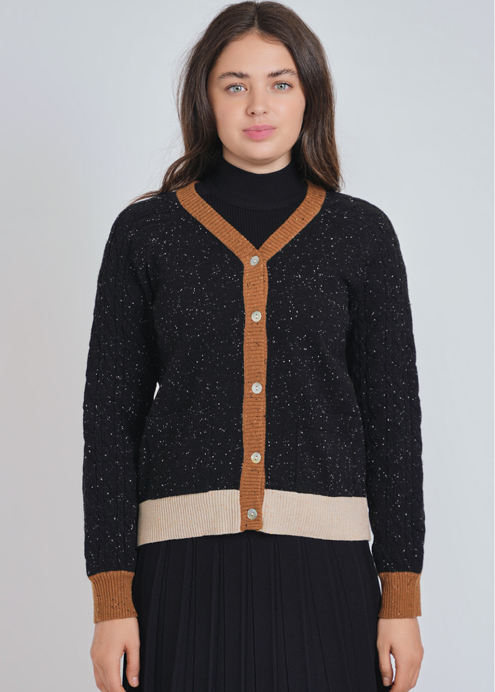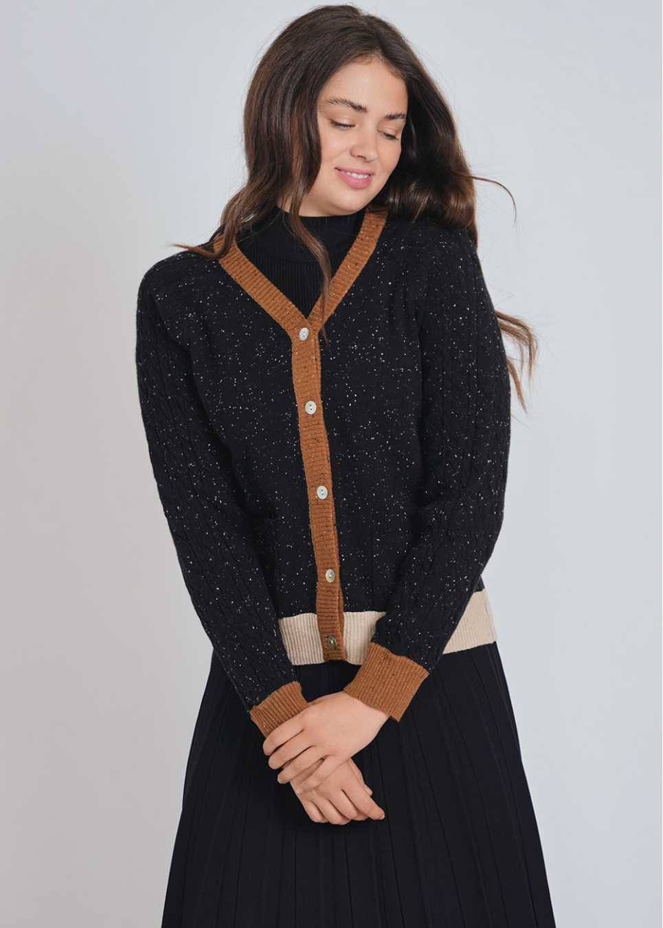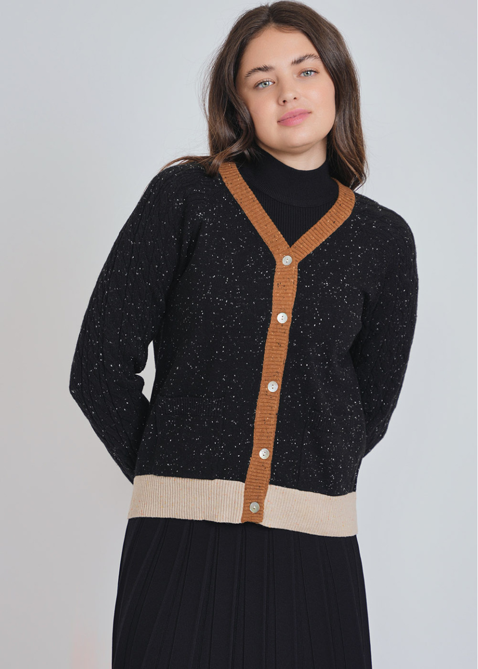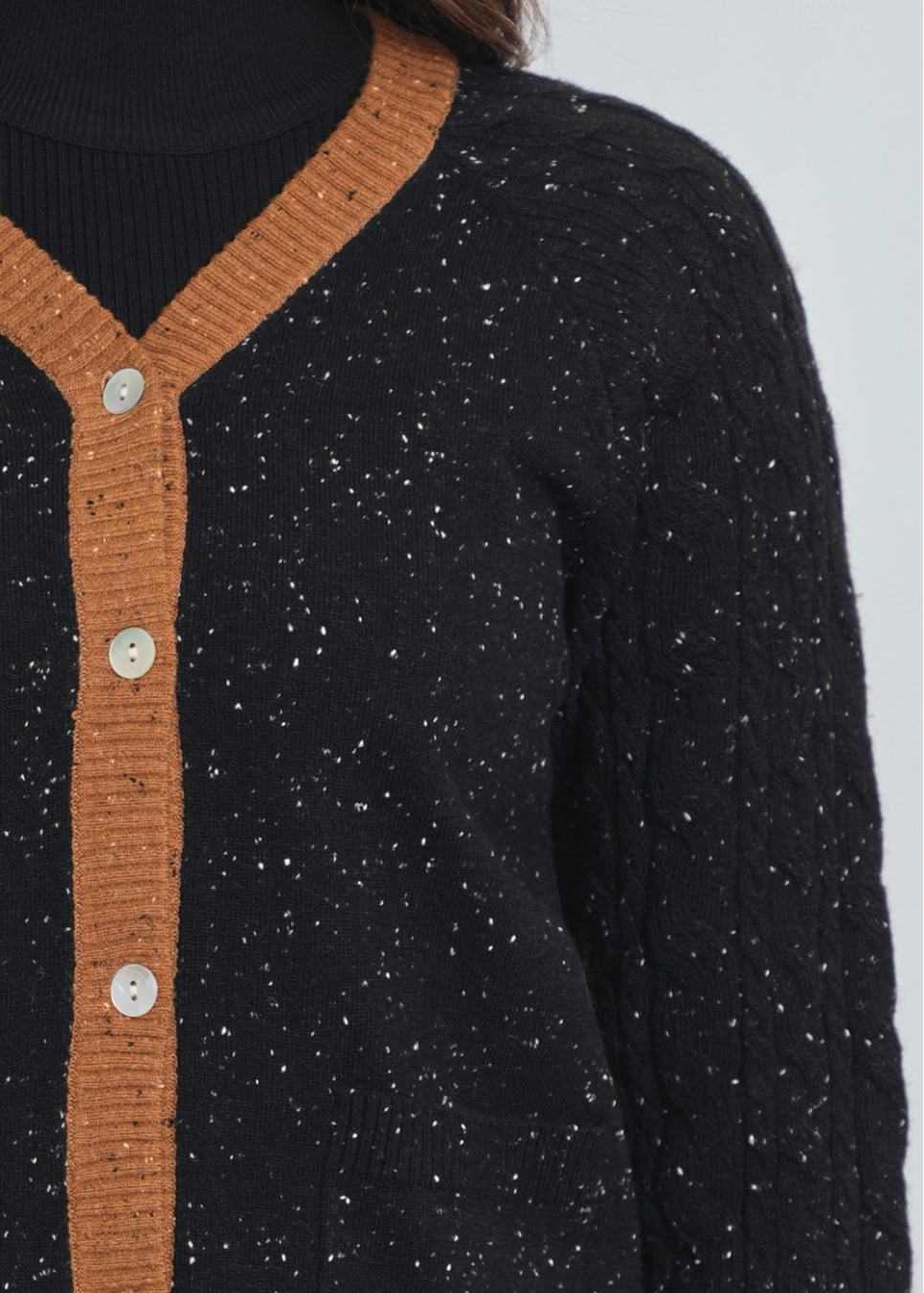Soft Black Cardigan: Timeless Specks and Cozy Camel Finishes