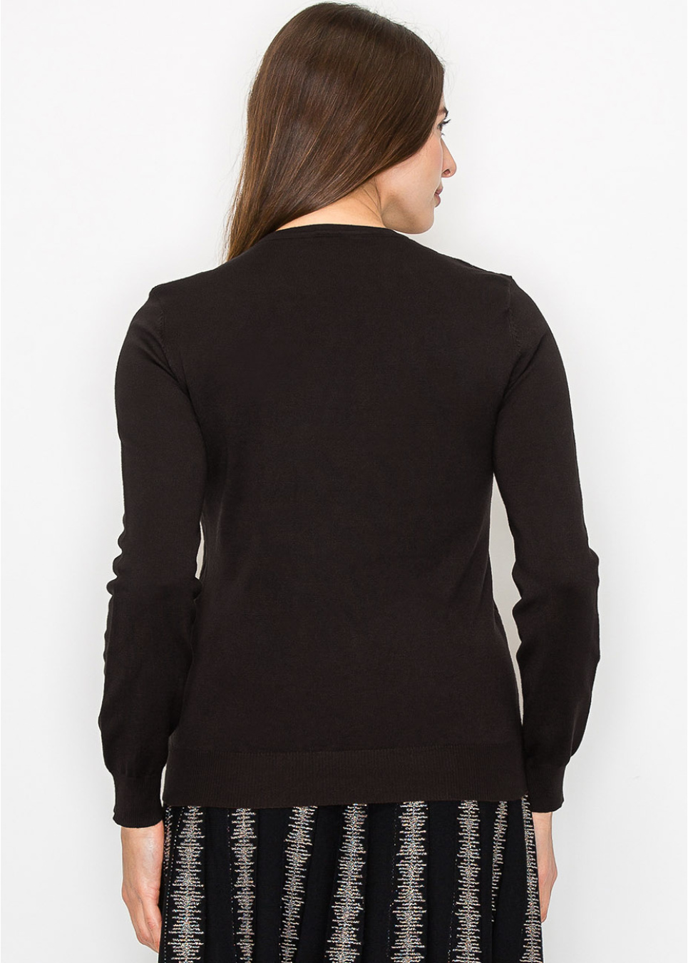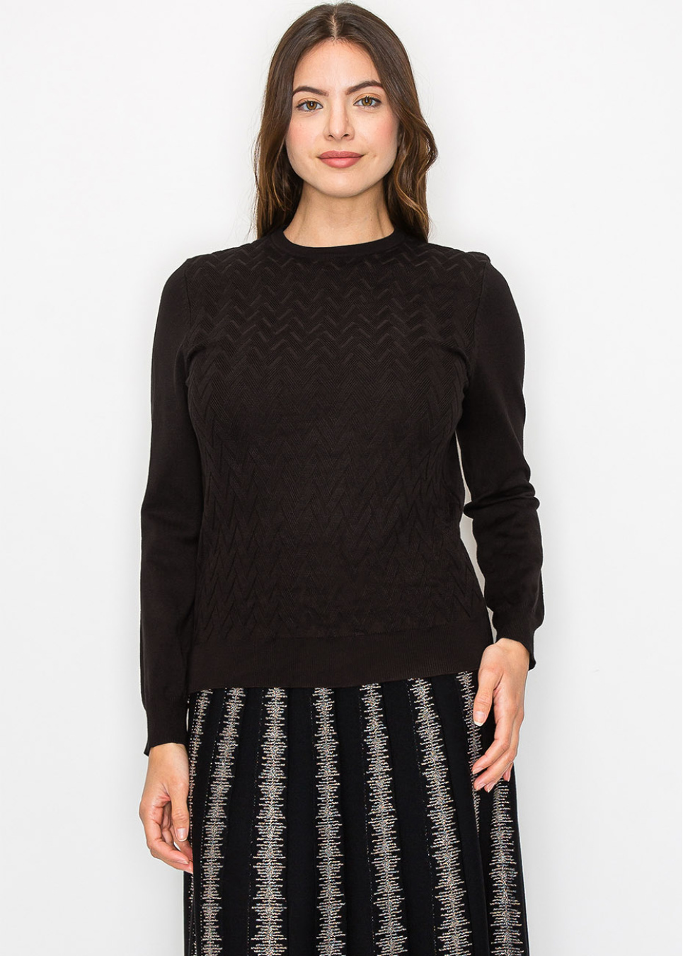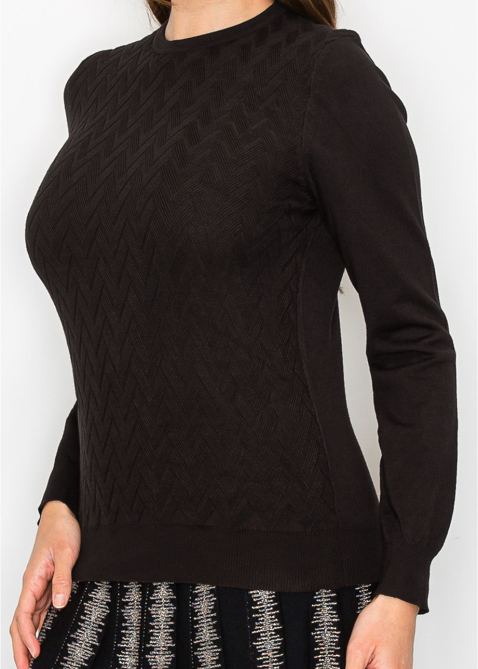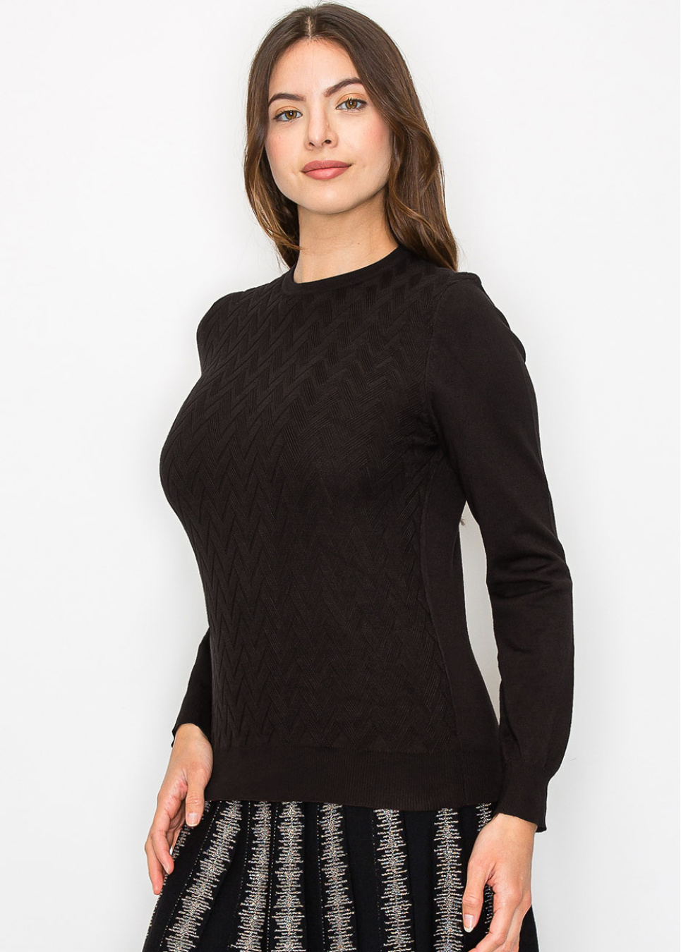 Embrace comfort and style with this soft black sweater featuring a delicate chevron pattern. The crew neck and fitted silhouette make it a perfect choice for layering or wearing on its own, offering a polished look for any occasion.