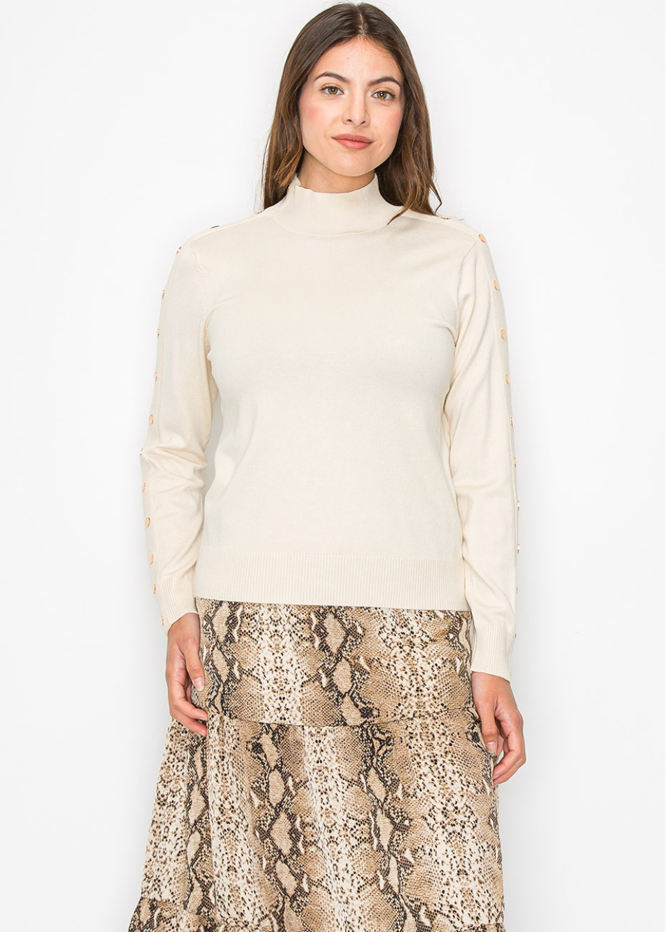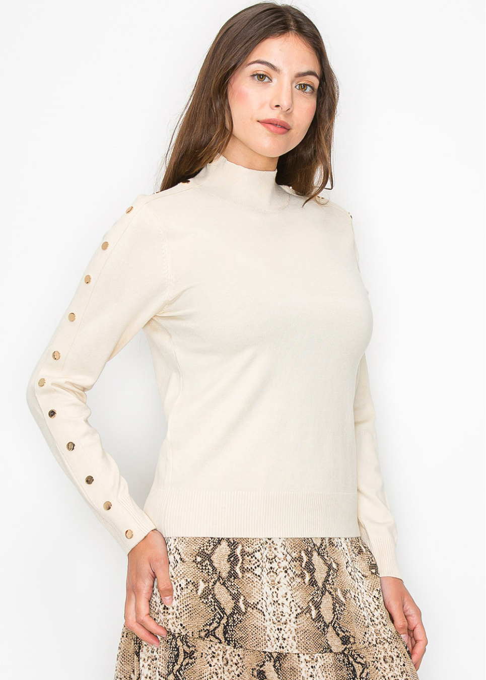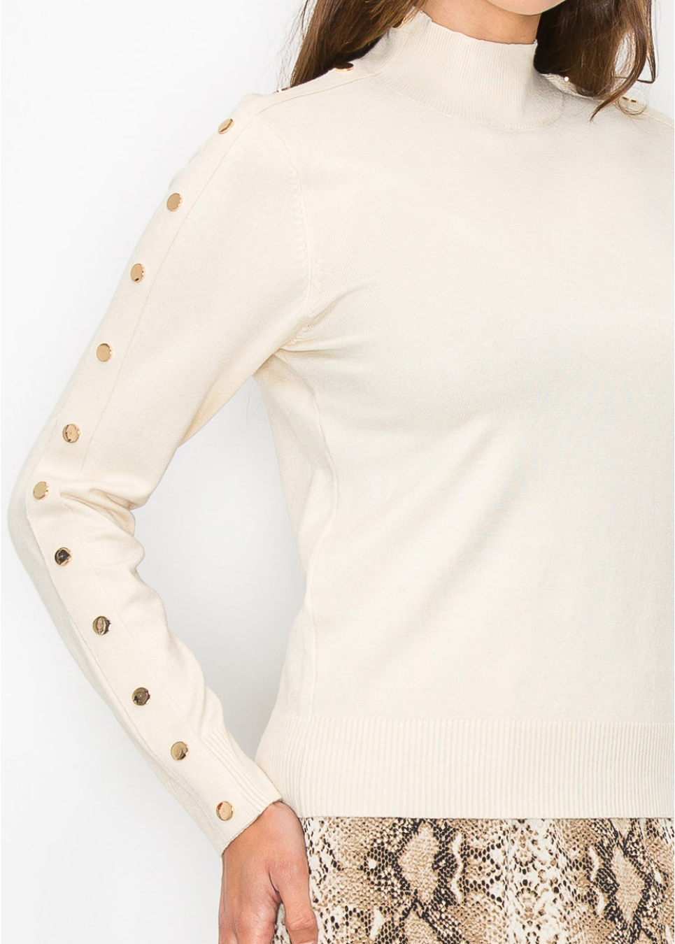 Embrace effortless style with this soft cream pullover. The button accents on the sleeves add a unique touch, making it stand out while still keeping things simple. Its cozy fabric and classic fit make it a go-to piece for casual outings or relaxing at home. Pair it with your favorite skirt for a polished, yet comfortable look.