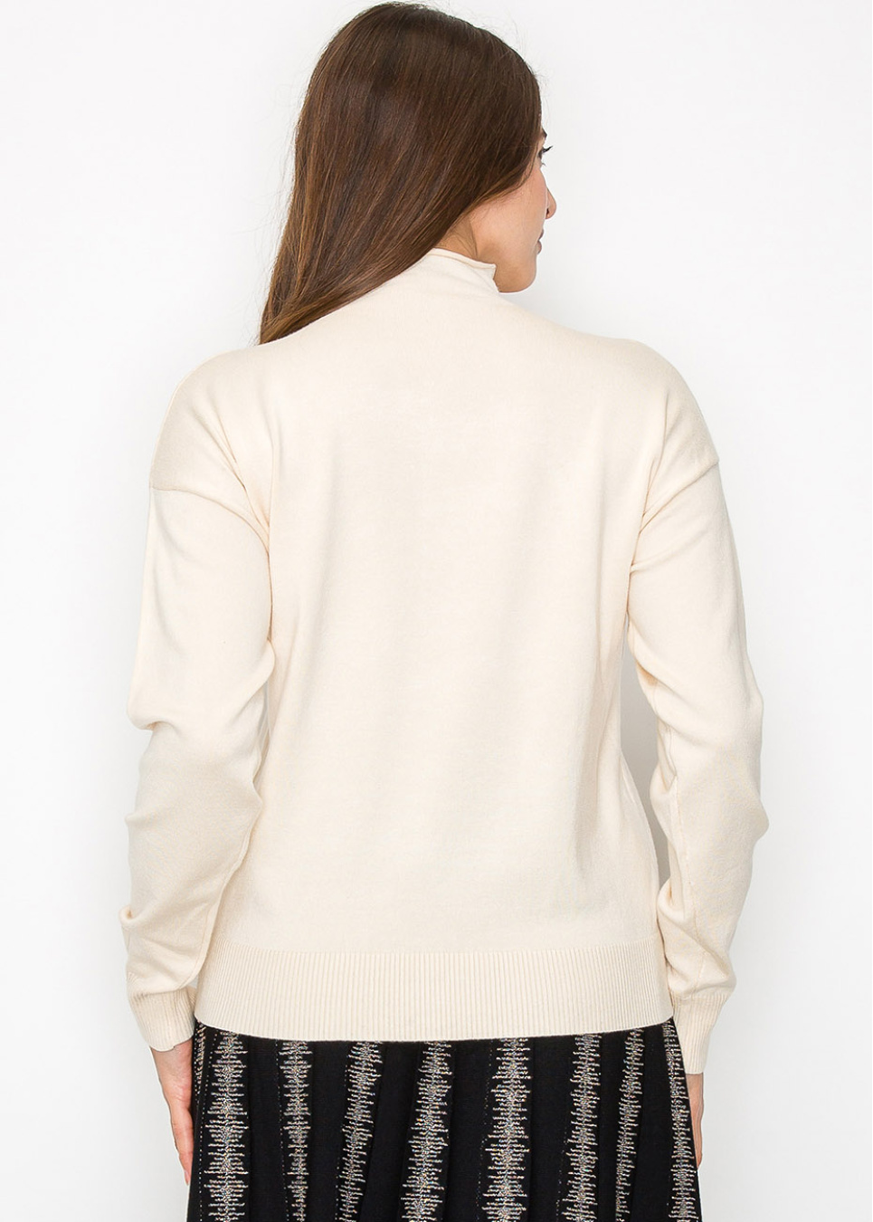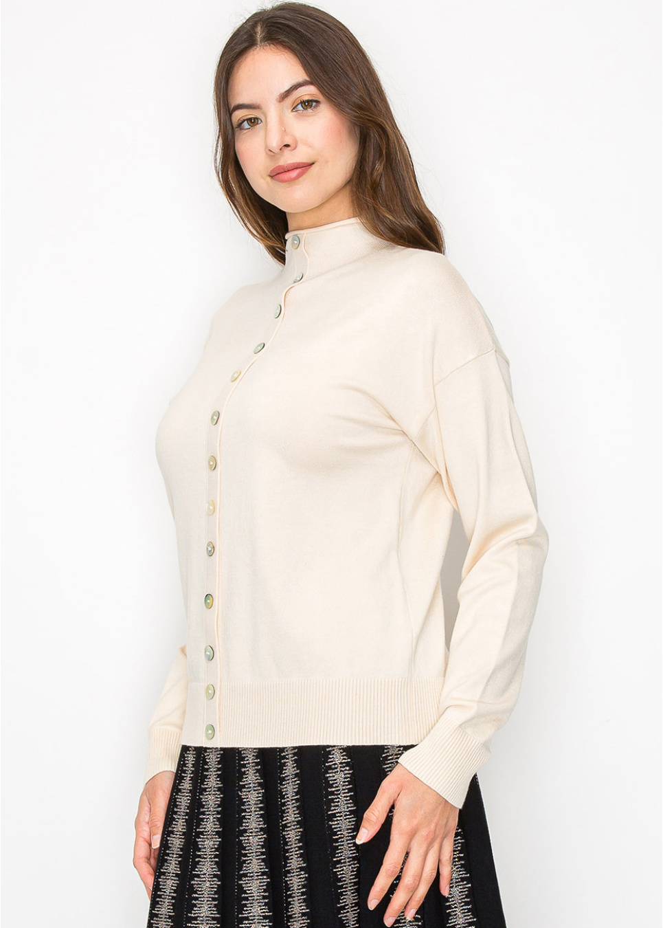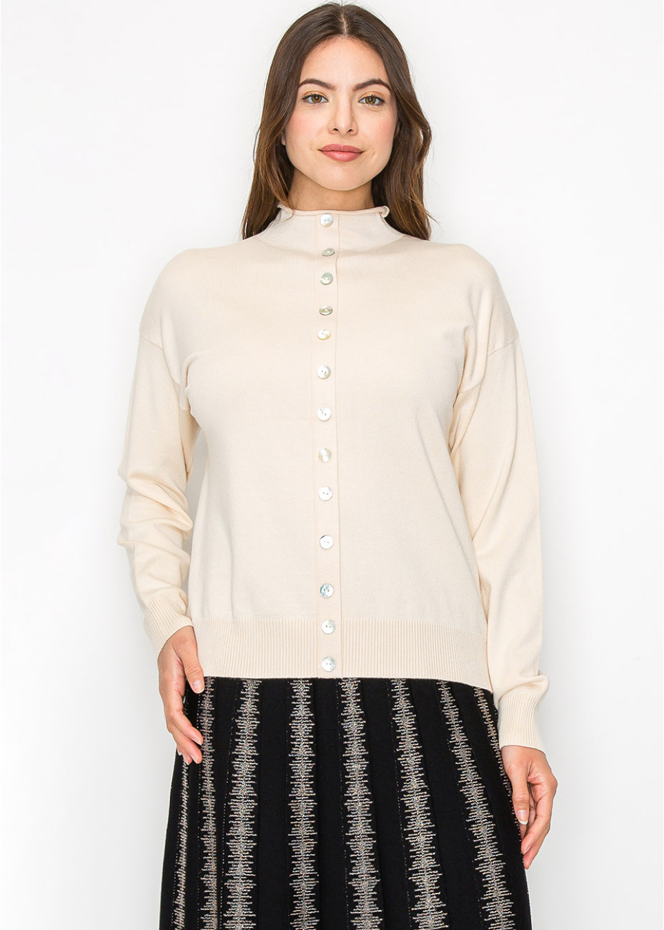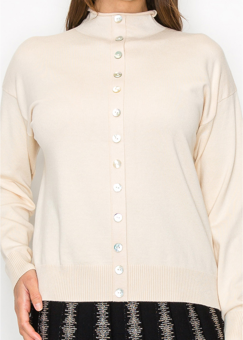 A cozy cream sweater with a high neckline, accented by decorative buttons. This piece is ideal for adding a subtle, elegant touch to your everyday wardrobe.