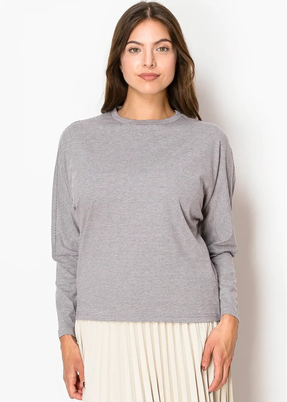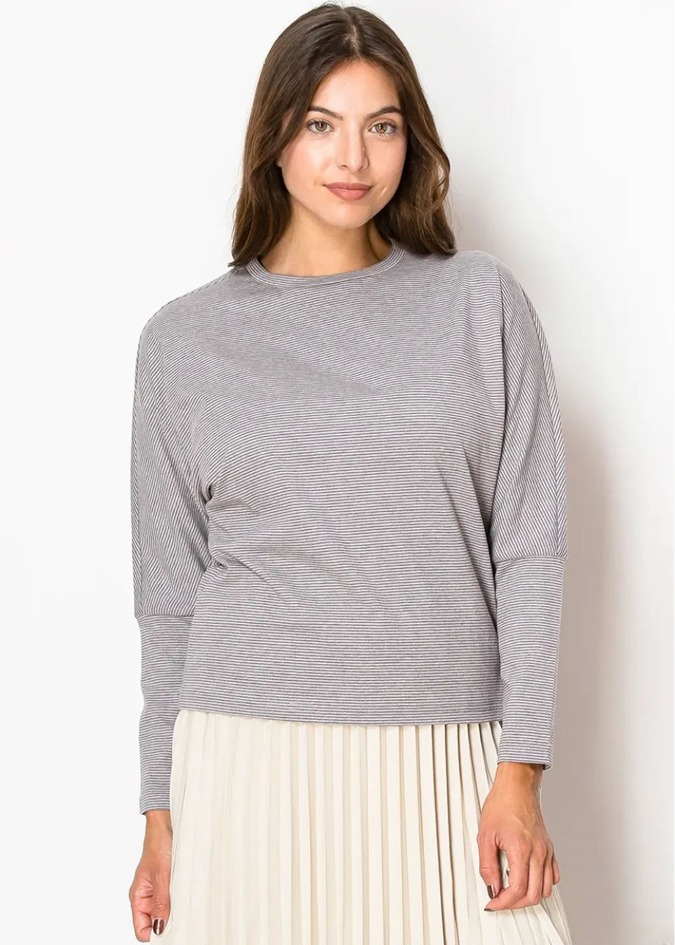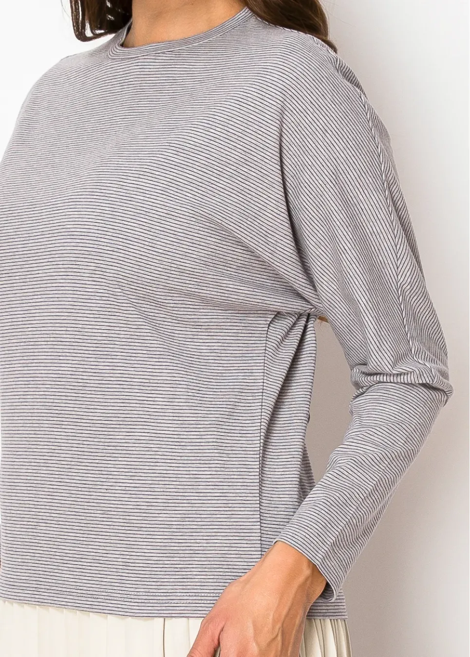 Comfort meets style in this long-sleeve tee with delicate grey stripes. Perfect for pairing with skirts or jeans, it’s a versatile addition to your wardrobe.