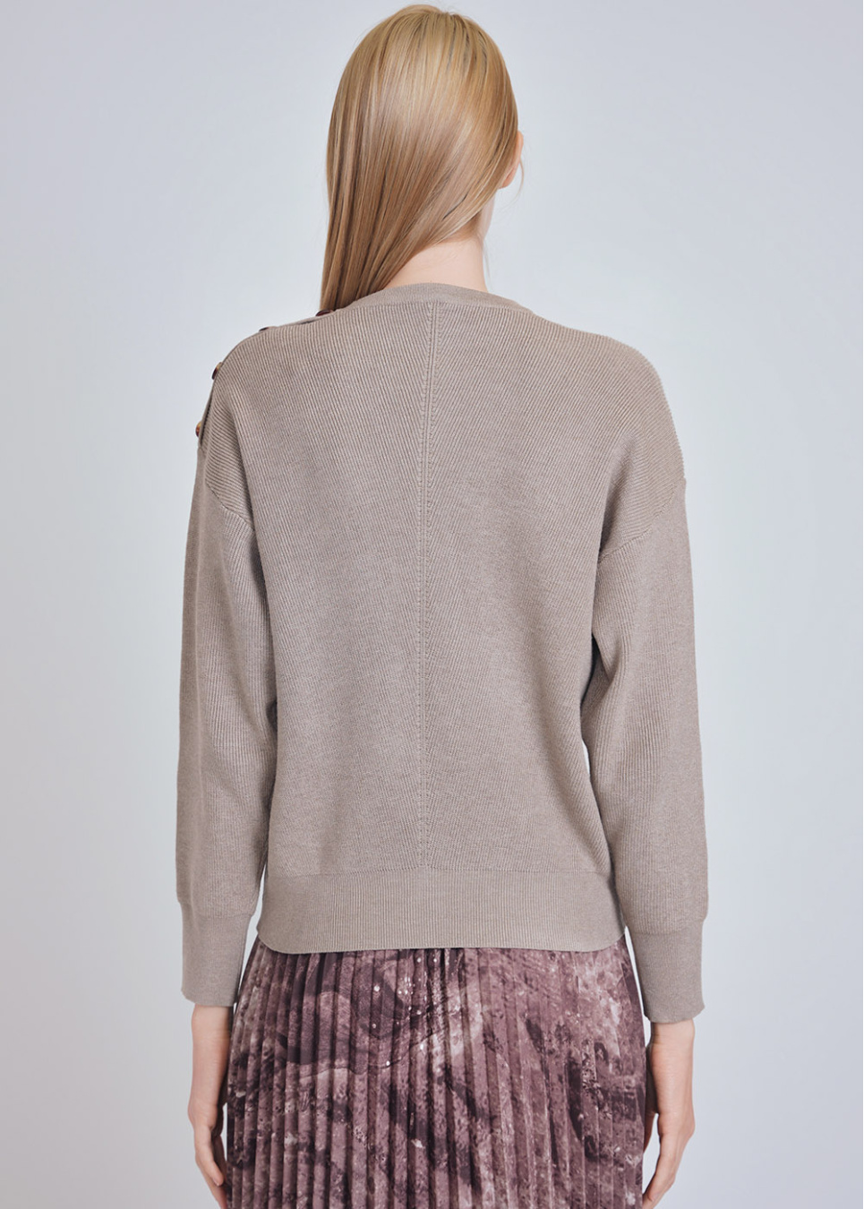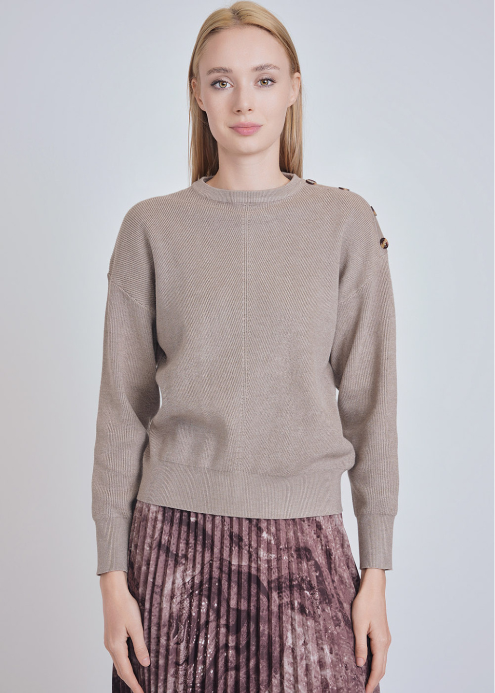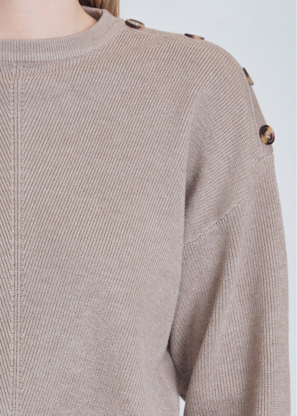 Soft Hue Beige Sweater: Knit & Button-Decorated Sleeves