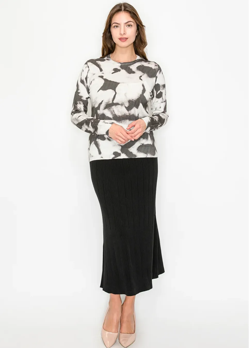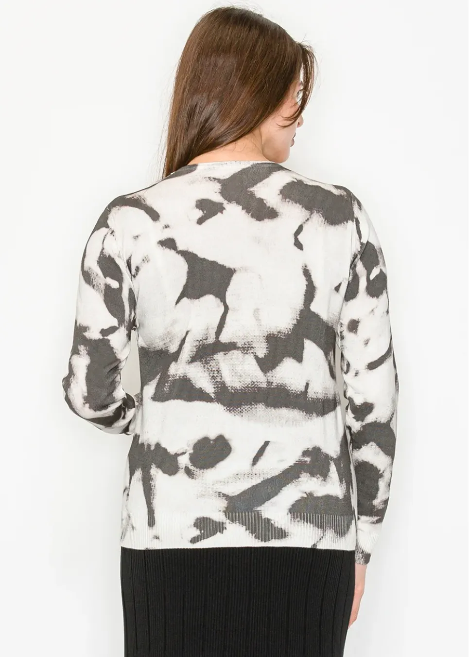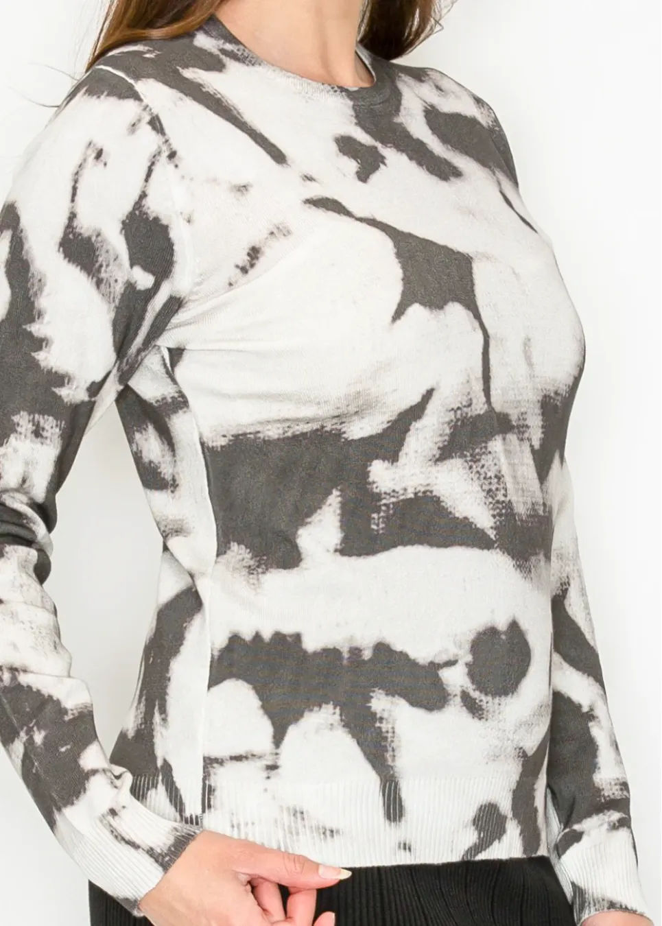 A lightweight knit with a bold twist. This soft pullover features an allover abstract print in black and ivory, adding just the right amount of edge to your everyday layers.