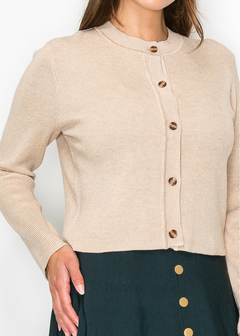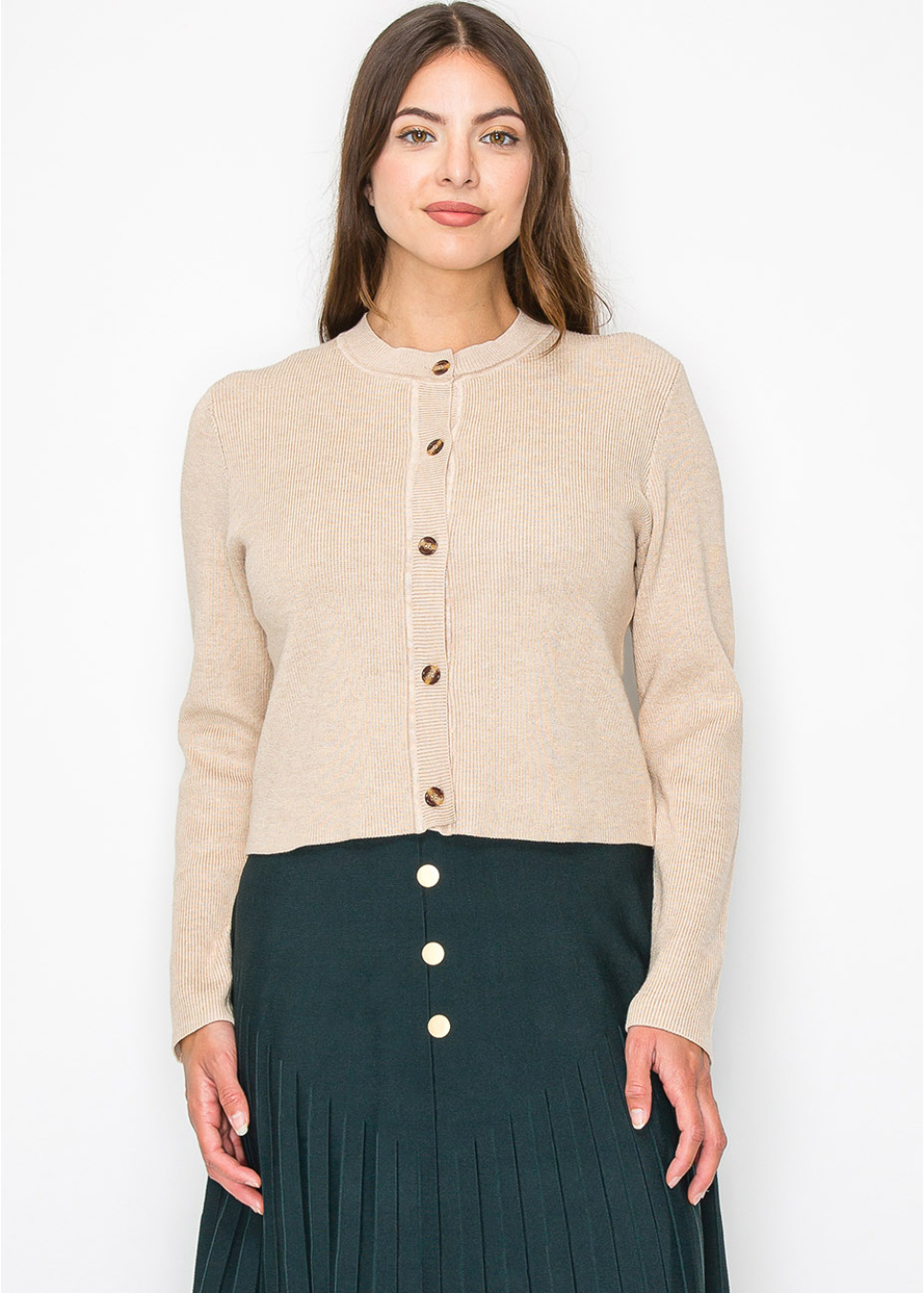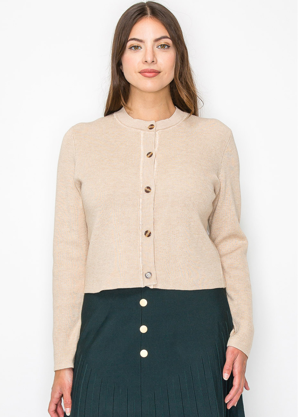 Crafted from soft ribbed knit, this oatmeal cardigan is perfect for layering. The neutral tone makes it easy to pair with anything in your closet, while the button-up front adds a classic element. Whether for work or casual wear, this cardigan is a timeless addition to your wardrobe.